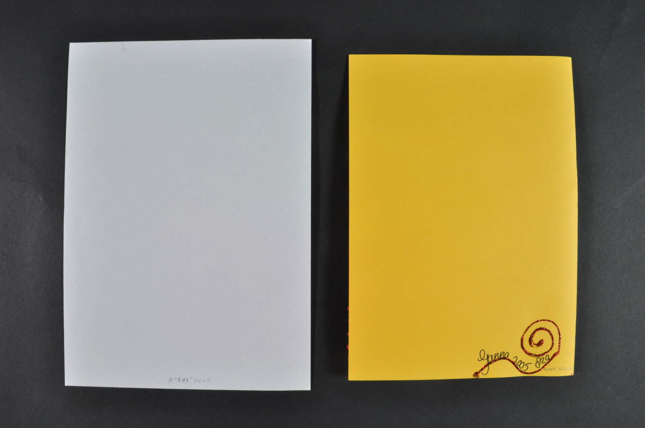 Photographie imprimée sur papier photographique. / Carte postale double en carton jaune, tenue dans le sens vertical.