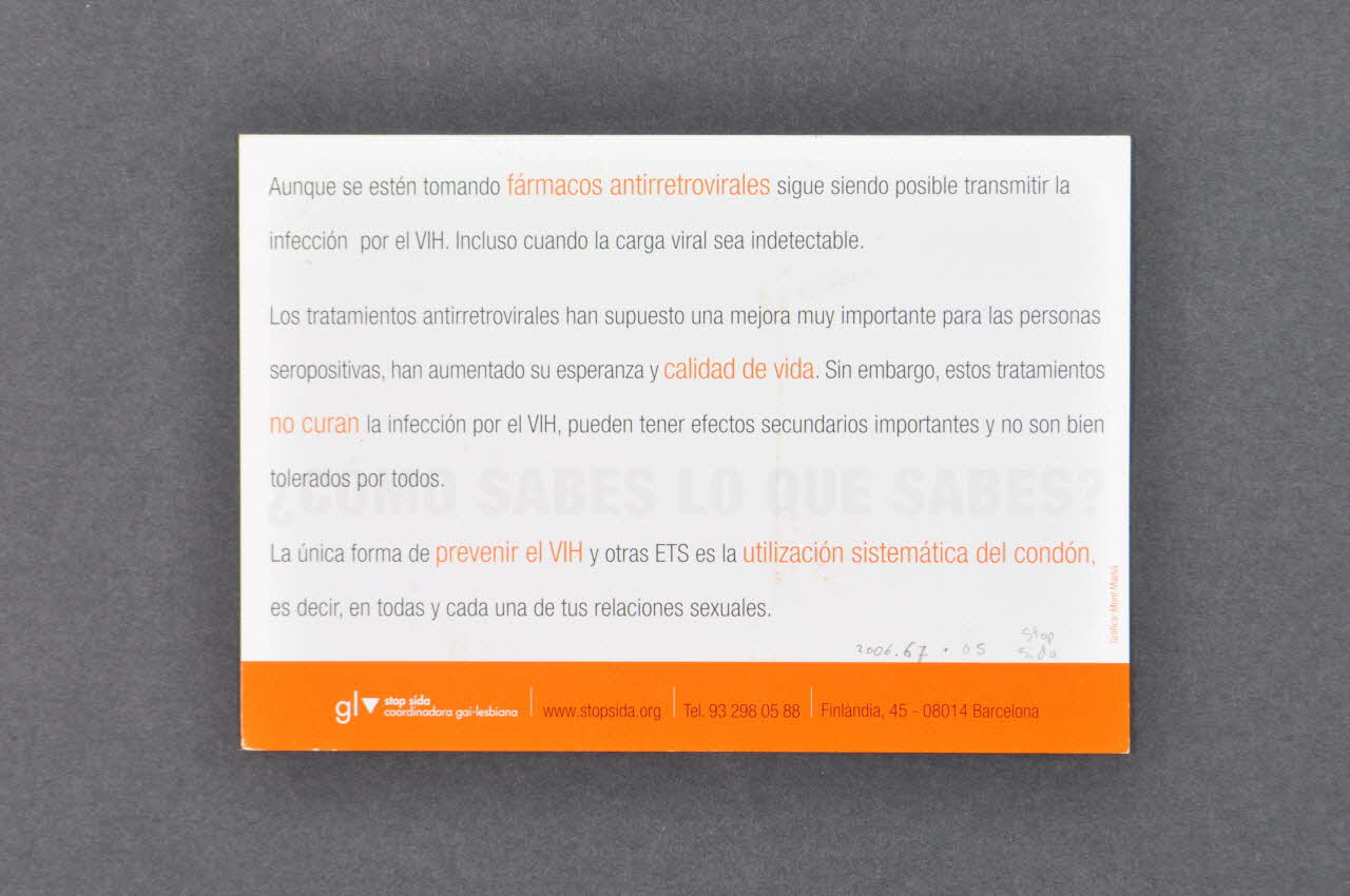 carte postale, "Los gays estan dejando de utilizar el condon para prevenir el VIH/Sida" (Les gays arrêtent d'utiliser le préservatif pour prévenir le VIH/SIda) / Como sabes lo que sabes ? (Comment sais tu ce que tu sais ?)