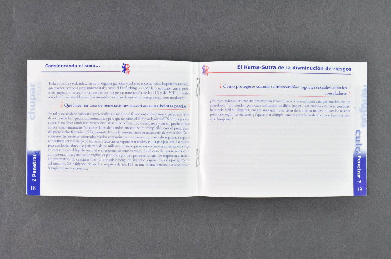 Sur la couverture, le fond est blanc et montre le dessin d'une montgolfière avec trois personnes dans la nacelle avec un préservatif jaune formant le ballon. Au dessus se trouve un titre en orange, en dessous, un slogan en bleu et un logo en bas en gris. A l'intérieur, le texte est noir sur fond blanc et en haut des pages se trouvent des vignettes avec des dessins.Inscriptions