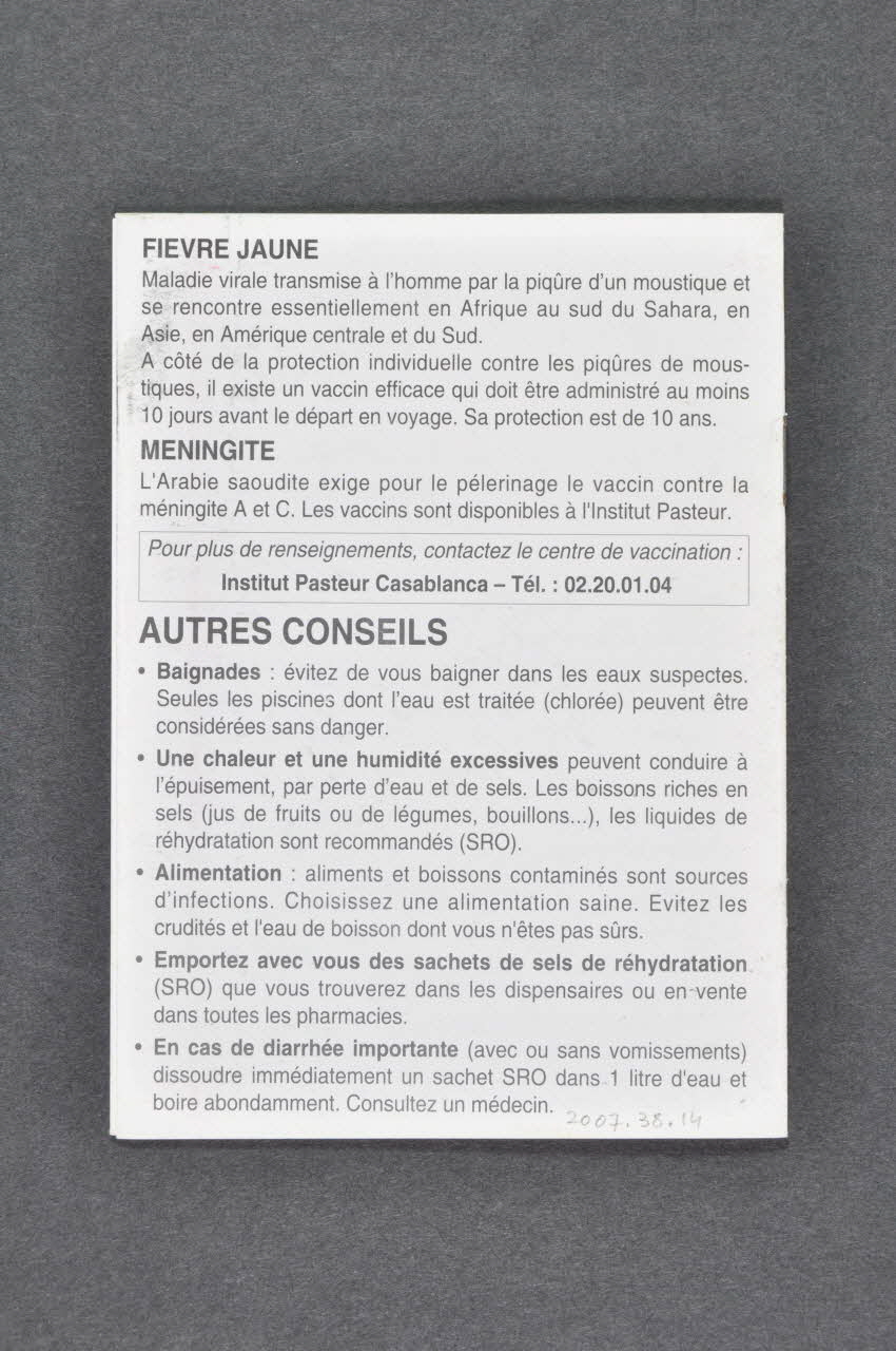 - Ce que vous devez savoir avant de partir en voyage (risques / mesures à prendre / vaccinations) // - Les M.S.T. (Maladies transmises lors des rapports sexuels) : Comment reconnaître une MST ? // - Comment se protéger contre les MST ? (... Exigez de vous- mêmes : l'utilisation du préservatif : ainsi vous prendrez soin de votre santé et de celle des autres. / Un comportement responsable en évitant la prostitution et la multiplication des partenaires sexuels) // - Le sida : Qu'est ce que le sida ? / Le sida se transmet... / Il n'existe pas d'autre mode de transmission / // Evitez absolument : Tout contact sexuel non protégé ; la prostitution ; la multiplication des partenaires sexuels ; l'utilisation d'aiguilles ou seringues déjà utilisées par d'autres ; la grossesse en cas d'infection par le virus / // Il n'existe ni traitement ni vaccin. La prévention est absolument vitale / // Adoptez : L'utilisation du préservatif du début à la fin de tous vos rapports sexuels ; La fidélité à vos conjoints ; L'utilisation des instruments perçant la peau, bien stérilisés ou à usage unique/ // Achetez les préservatifs et gardez-les en permanence avec vous // // - Quelques autres risques : paludisme / fièvre jaune / méningite // - Autres conseils : baignades / chaleur et humidité excessives / alimentation / sachets de sels de réhydratation / en cas de diarrhée importante. (Liste des thèmes abordés), à l'intérieurLogo