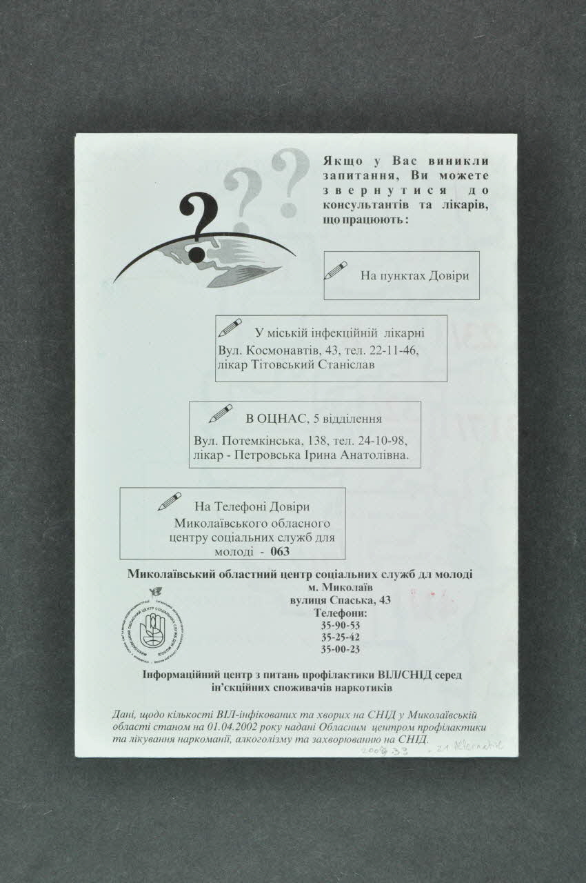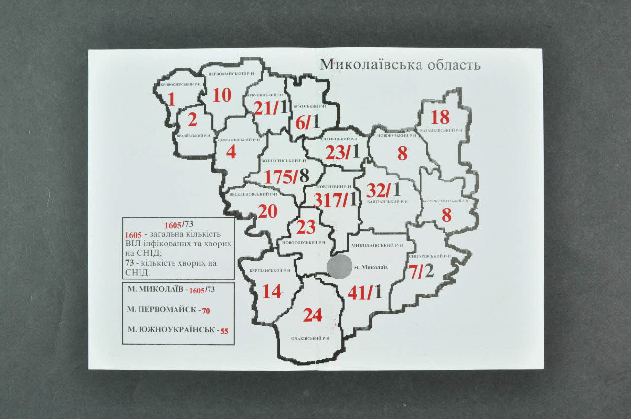 De forme rectangulaire, le dépliant en papier blanc est plié en deux. Il se lit verticalement. Il est imprimé en Unkrainien, en alphabet cyrillique. Sur la couverture, des inscriptions noires encadrent une carte grise de l'Ukraine. Au dos, des inscriptions noires, dont certaines encadrées, sont accompagnées d'un schéma représentant une portion de la Terre surmontée de points d'interrogation et d'un logo. A l'intérieur est imprimée en noir une carte de l'Ukraine découpée en régions. Chaque région contient une inscription noire et un ou deux chiffres noir ou rouge. Le coin inférieur gauche est occupé par des inscriptions noires et rouges encadrées en noir.