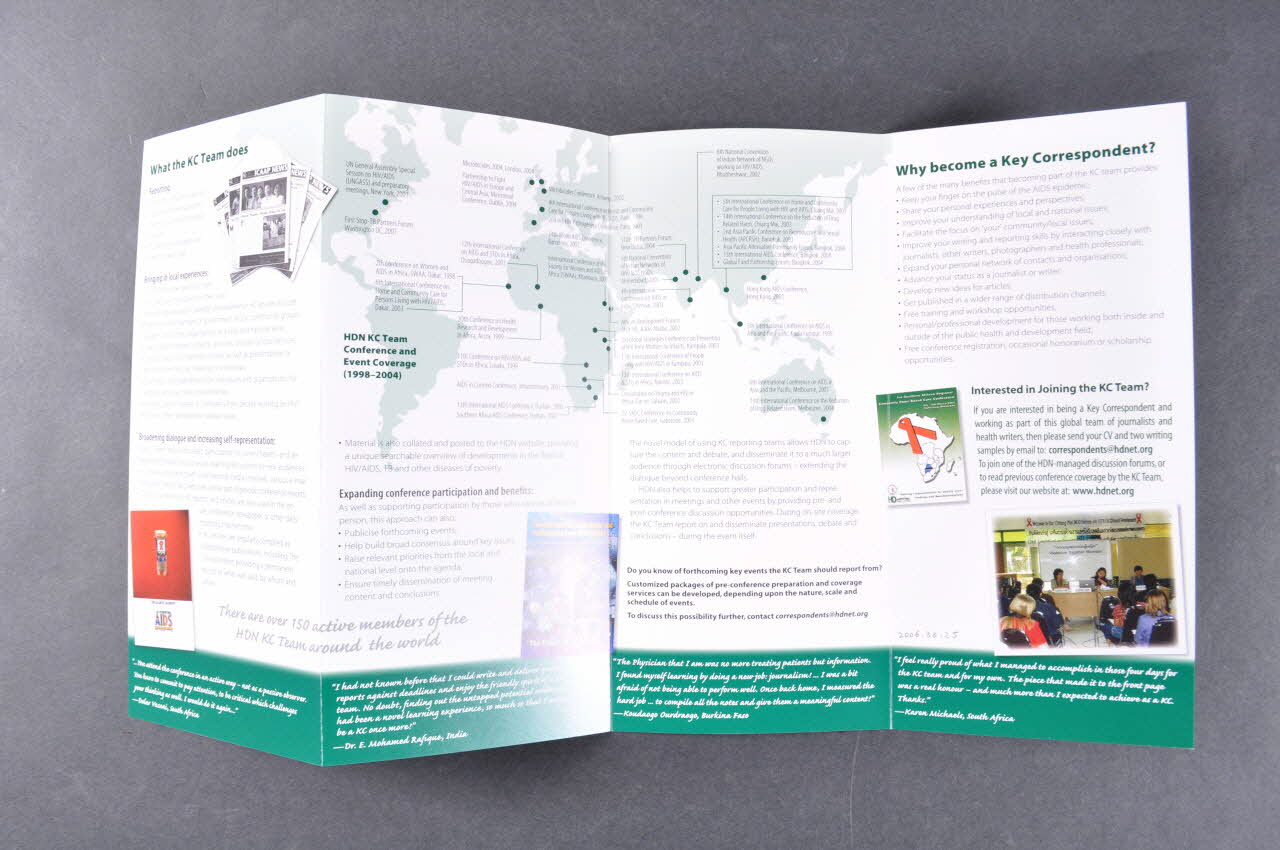 Dépliant rectangulaire à quatre volets de papier glacé cartonné, tenu verticalement.