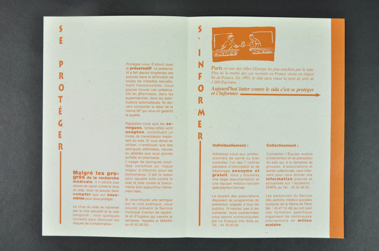 Cette brochure était contenue dans 2002.112.107.1 / Résumé. Feuillet 2 Titre vertical : "Se protéger" : "Malgré les progrès de la recherche médicale, il n'existe pas encore de vaccin contre le virus du sida. Vous ne pouvez donc compter que sur vous-même pour vous protéger. (...) Protégez vous d'abord avec le préservatif. (...). Rappelez-vous que les seringues, lorsqu'elles sont usagées, constituent un mode de transmission important du sida. (...) Feuillet 3 Titre vertical : "S'informer" (En haut, la même vignette brune) En dessous : "Paris est une des villes d'Europe les plus touchées par le sida.(...) Aujourd'hui lutter contre le sida, c'est se protéger et s'informer. Individuellement (...) Collectivement (...) interventions en milieu scolaire.