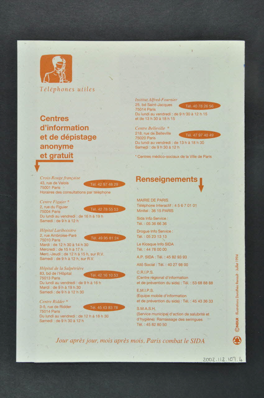 Téléphones utiles // // Centres // d'information // et de dépistage // anonyme // et gratuit // // Croix-Rouge française // 43 rue de Valois // 75001 Paris // Tél. 42 97 48 29 // // [...] (Au centre, en orange), versoSlogan