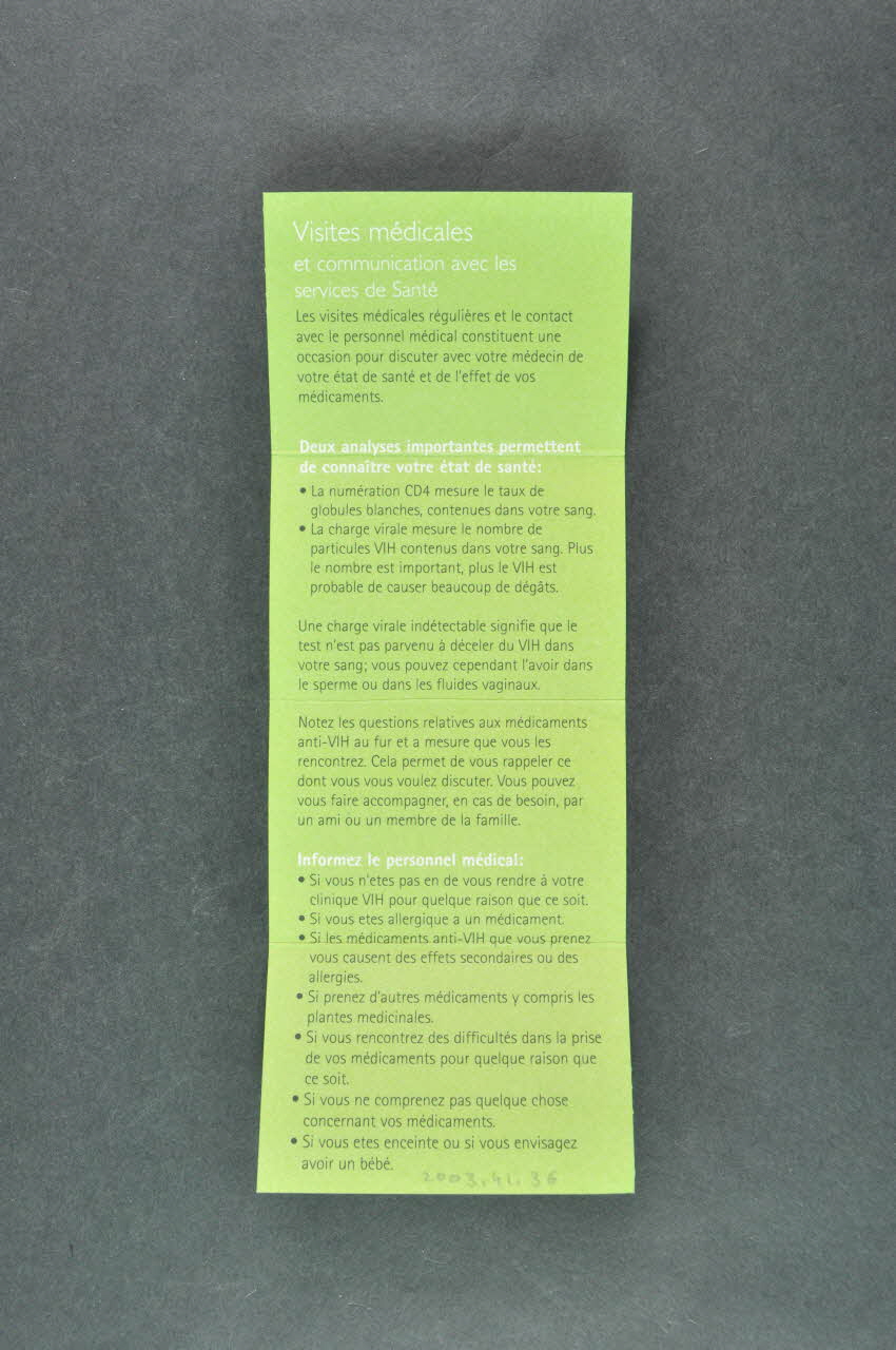 Visites médicales // et communication avec // les services de Santé (Le texte est marqué en caractères blanc sur le recto du dépliant.), rectoAdresse, numéro