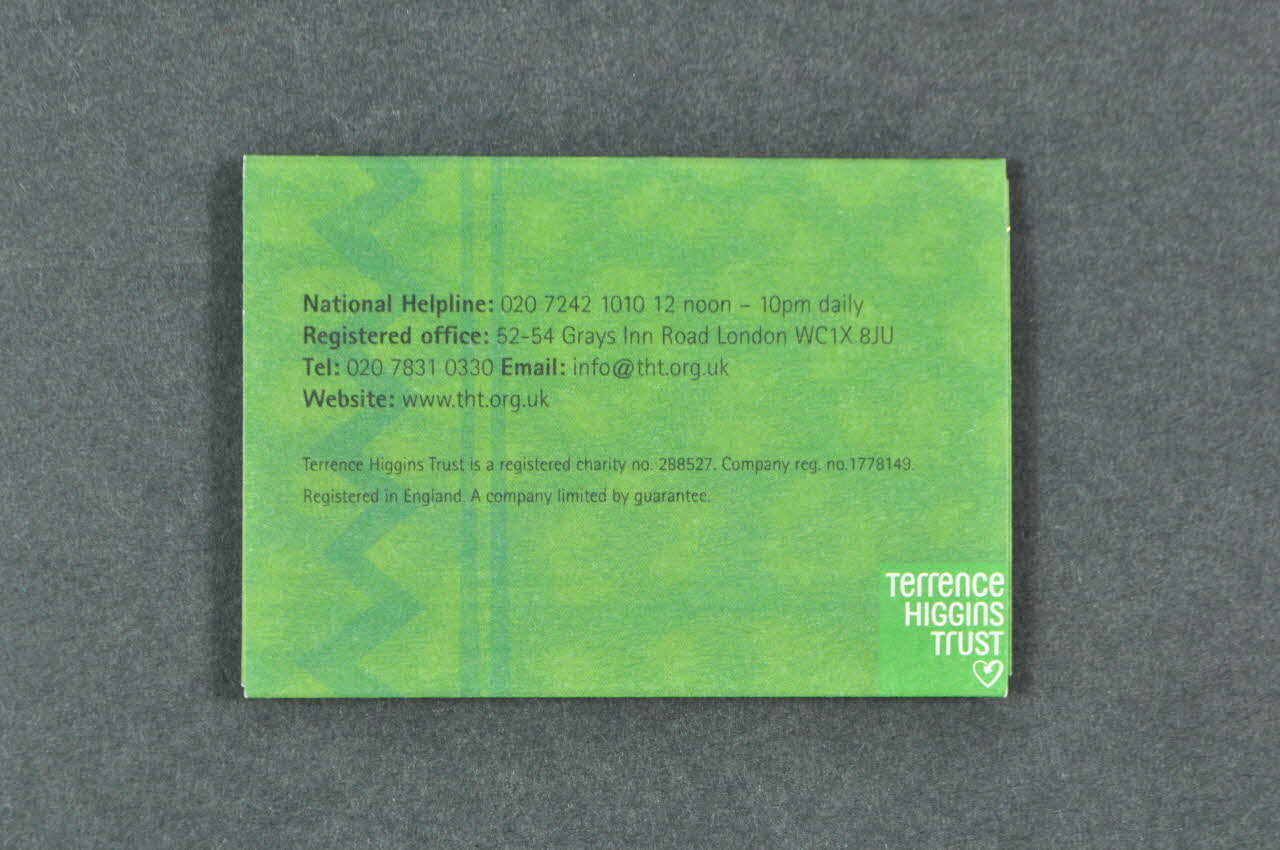 National Helpline: 020 7242 1010 12 noon - 10pm daily // Registred office: 52-54 Grays Inn Road London WC1X8JU // Tel: 020 7831 0330 Email: info@tht.org.uk // Website: www.tht.org.uk (L'inscritption est marquée en caractères noirs dans la partie centrale du verso.), versoNom d'association, logo
