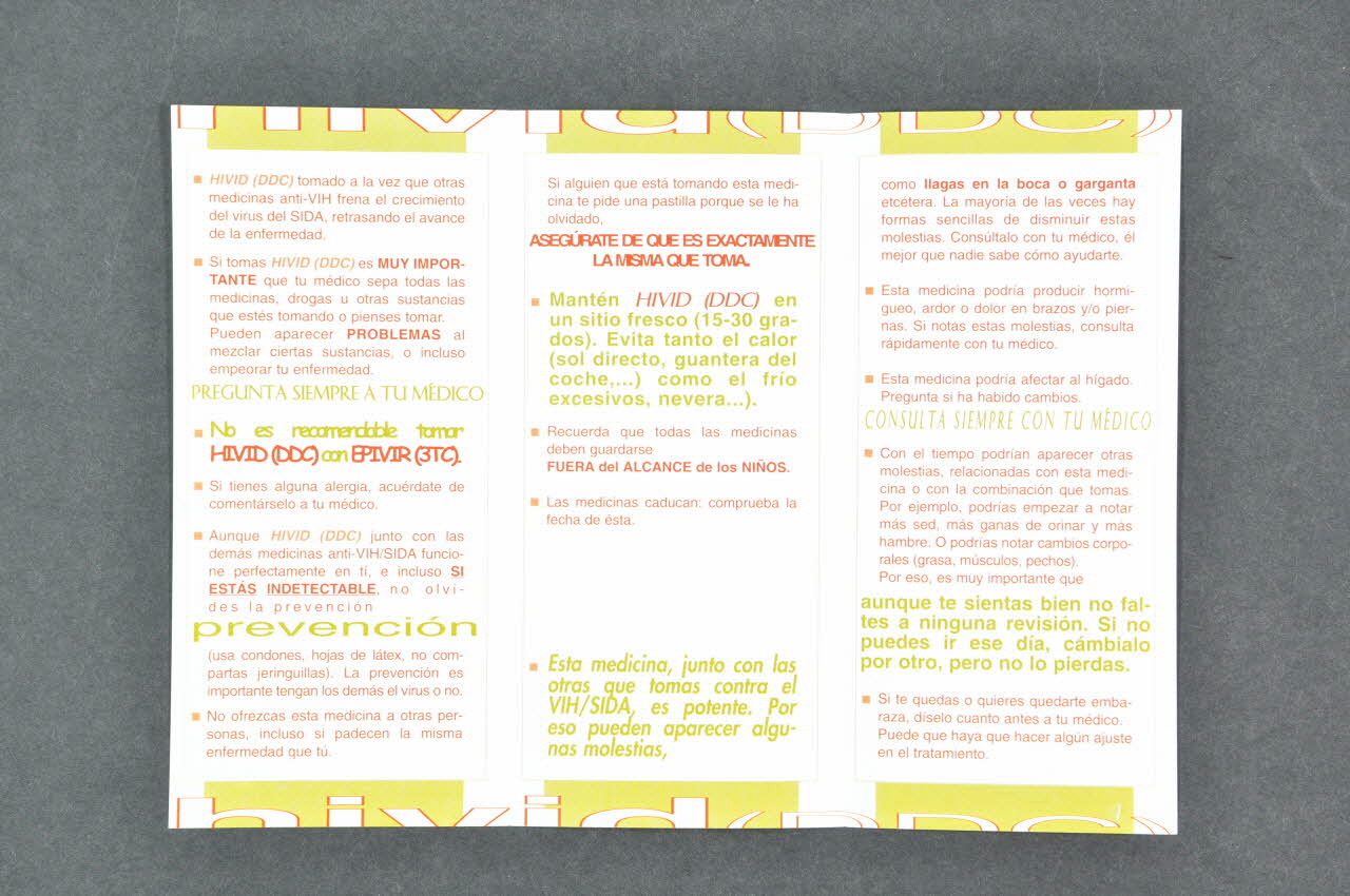 PREGUNTA SIEMPRE A TU MEDICO // // No es recomendable tomar // HIVID (DDC) con EPIVIR (3TC) // // no olvides la // prevención // // Mantén HIVID (DDC) // en un sitio fresco (15-30 // grados). Evita tanto el calor // (sol directo, guantera del // coche,...) como el frio exce- // sivos (nevera,...) // // FUERA del ALCANCE de los NIÑOS. // // Esta medicina, junto con las otras // que tomas contra el VIH/SIDA, // es potente. Por eso pueden apa- // recer algunas molestias, // // CONSULTA SIEMPRE CON TU MEDICO // // aunque te sientas bien no faltes a nin- // guna revisión. Si no puedes ir ese dia, // cambialo por otro, pero no lo pierdas. // // SI TE OLVIDA LA TOMA // // SI INTERRUMPES EL TRATAMIENTO // ANTI-SIDA // // SI VOMITAS LAS PASTILLAS // // Es peor tomar mal las medi- // cinas que no tomarlas (Au recto et au verso.)Décor