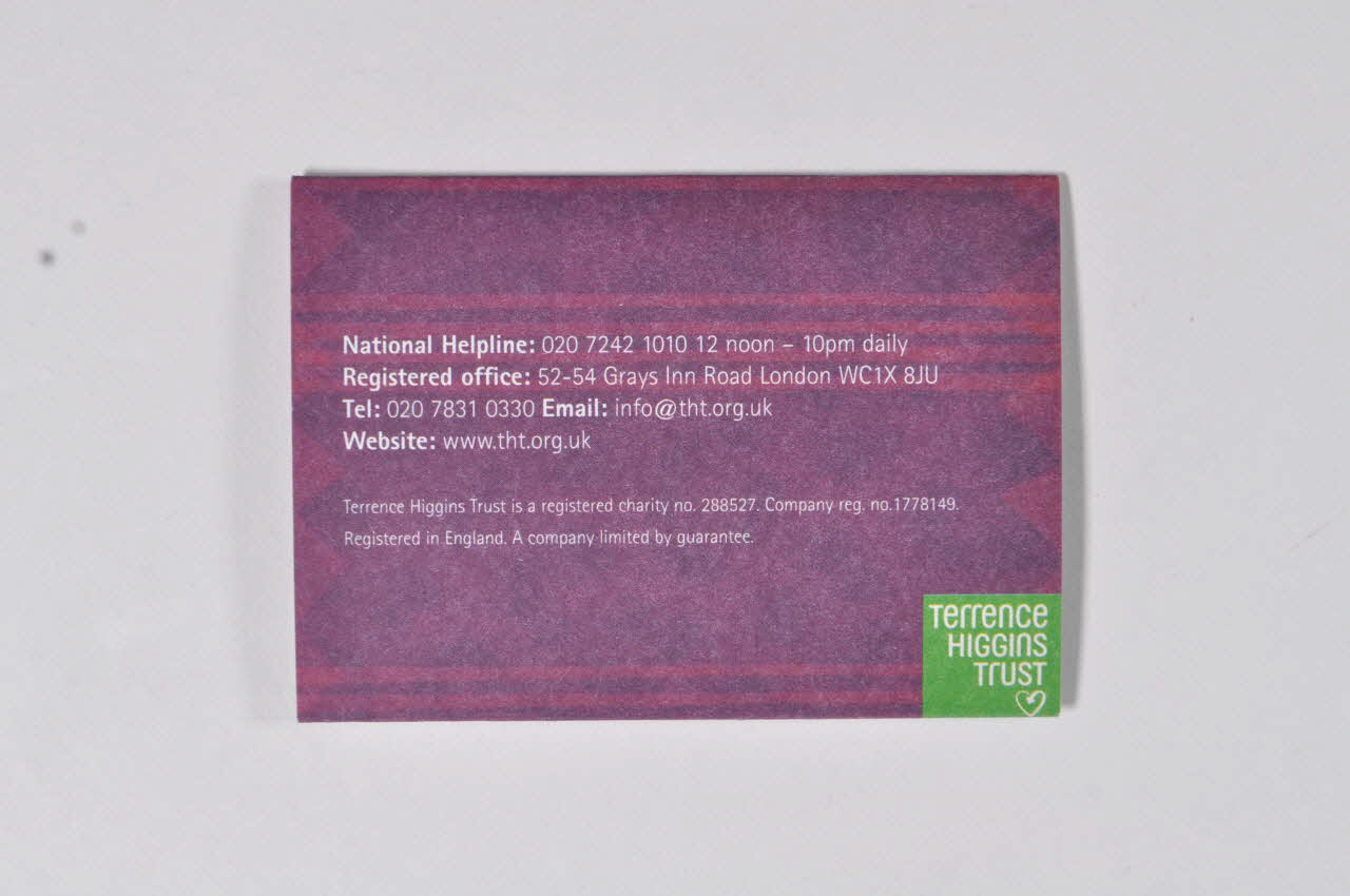 National Helpline : 020 7242 1010 12 noon-10pm daily // Registered office : 52-54 Grays Inn Road London WC1X8JU // Tel : 020 7831 0330 Email : info@tht.org.uk // Website : www.tht.org.uk // // Terence Higgins Trust is a registered charity no.288527. Company reg. no.1778149. // registered in England. A company limited by guarantee. // // Terrence // Higgins // Trust (au dos)Adresse