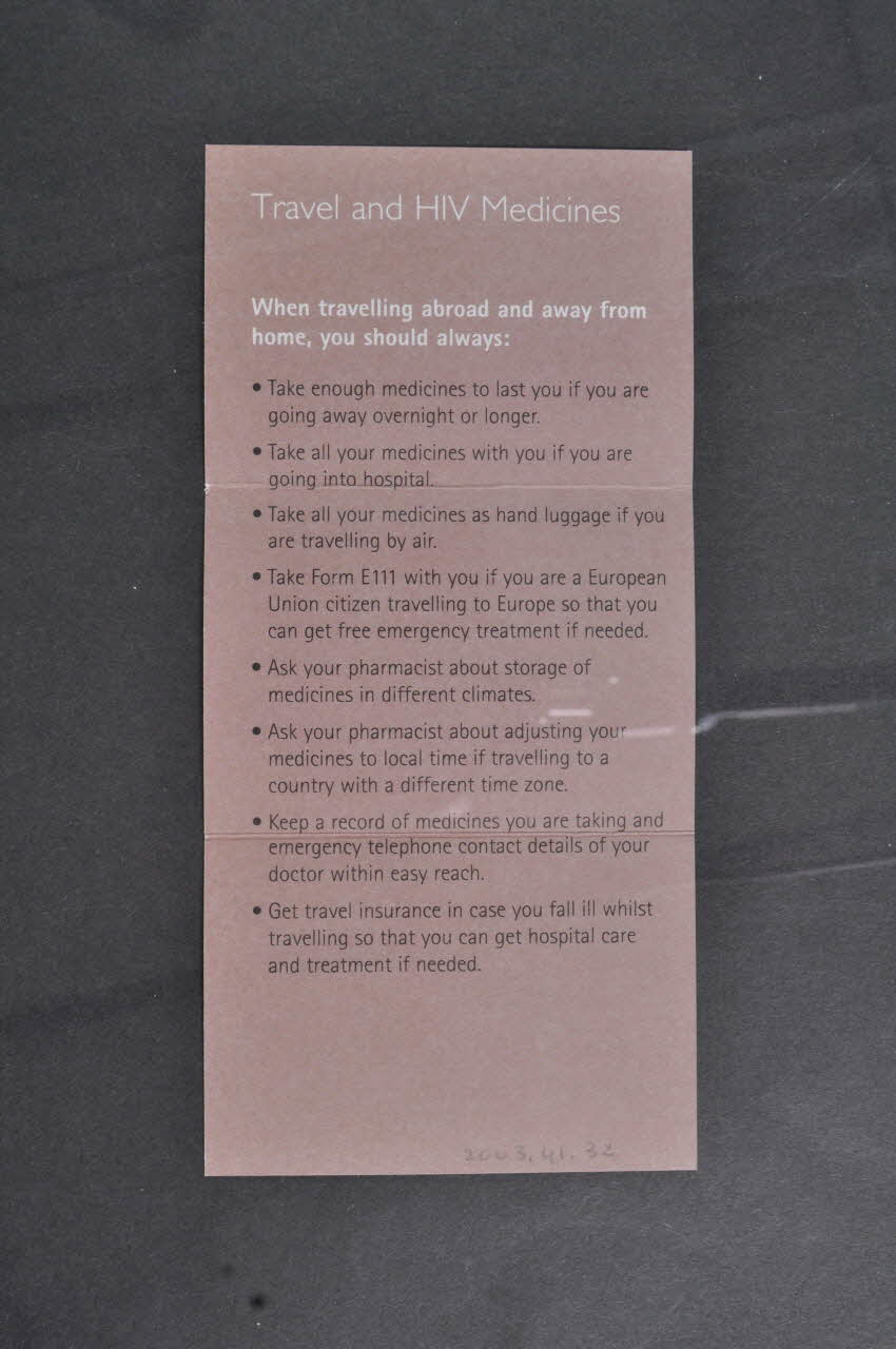 Dépliant, Dépliant "Travel and HIV Medicines" (Voyage et traitements contre le VIH)
