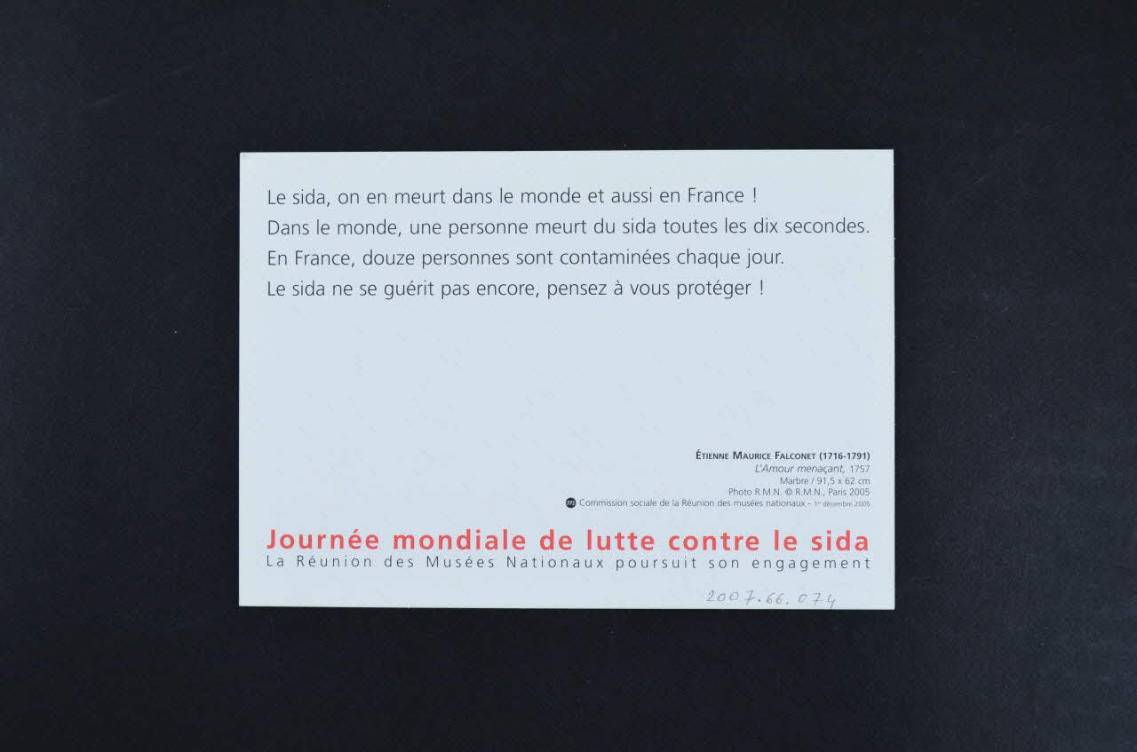 carte postale, 1er décembre 2005. Journée mondiale de lutte contre le sida. La Réunion des Musées Nationaux poursuit son engagement. / Etienne Maurice Falconet. L'amour menaçant