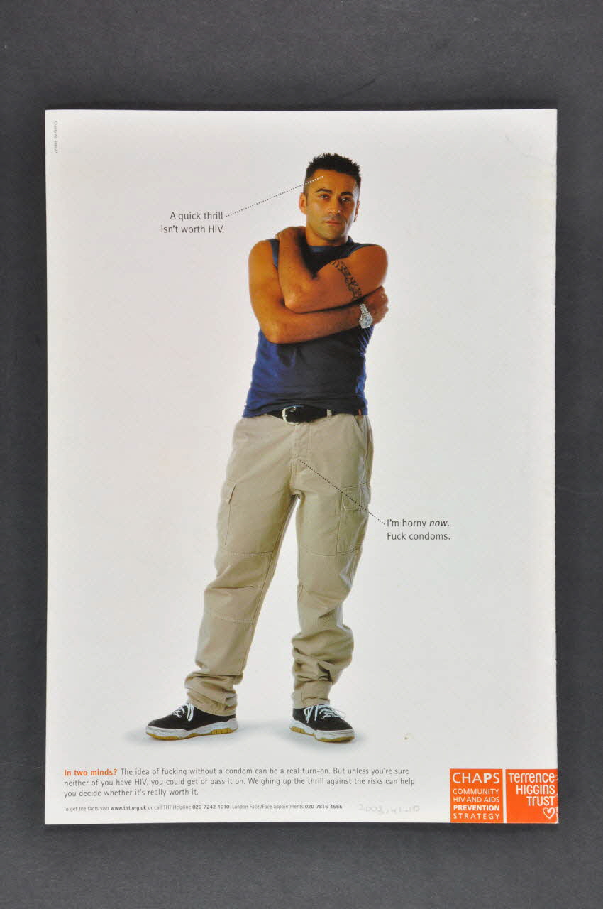 CHAPS // COMMUNITY // HIV AND AIDS // PREVENTION // STRATEGY (Imprimé en blanc dans un encadré carré orange, en bas à droite), versoTerrence // Higgins // Trust (Imprimé en blanc dans un encadré carré orange, en bas à droite), versoTitre
