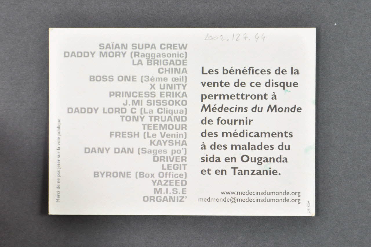 carte postale, "Les Lascars contre le sida" / "Les bénéfices de la vente de ce disque permettront à Médecins du Monde de fournir des médicaments à des malades du sida en Ouganda et en Tanzanie"