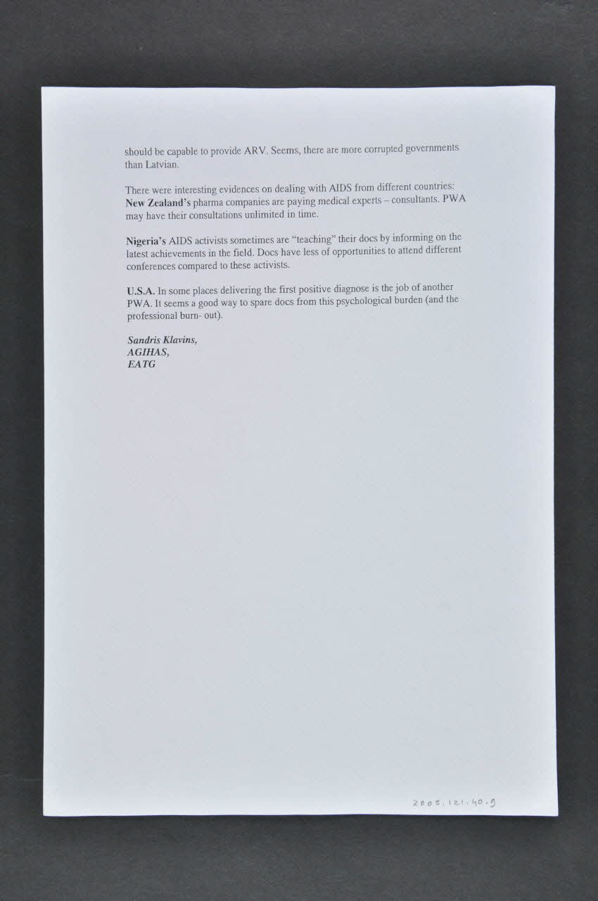 Fait partie d'une série de documents envoyés ensemble par l'association comme significatifs de son action. Dans une lettre d'accompagnement, le responsable de l'association s'excuse du retard mis à répondre à la demande de documentation et donne l'explication suivante : "Pour être honnête, au tout début, votre proposition m'a rendu très pessimiste. Je me demandais l'utilité de collecter tous ces matériaux. Maintenant, en y repensant, je suis arrivé à une conclusion différente : nous n'avons pas d'archives, et maintenant nos publications vont être gardées pour la postériorité au coeur de l'Europe ! Merci pour cette proposition merveilleuse et pour tous vos efforts."