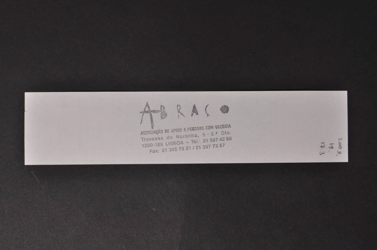 ABRACO // ASSOCIACAO DE APOIO A PESSOAS COM VIH/SIDA // Travessa do Noronha, 5 - 3 Dto // 1250-169 LISBOA - Tel: 21 397 42 98 // Fax: 21 395 79 21 / 21 397 73 57 (Coordonnées de l'association tamponnées en noir au revers.)Décor