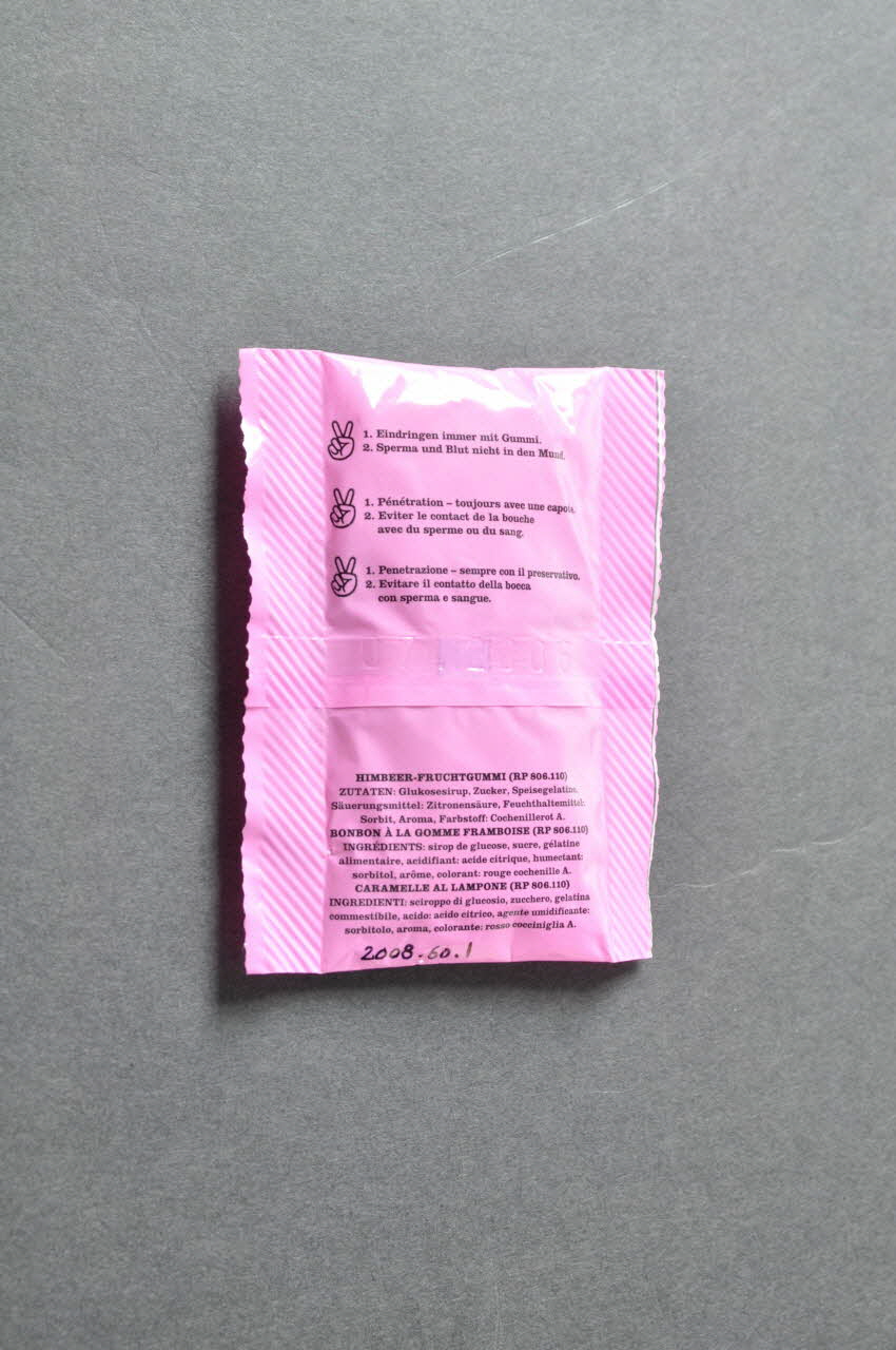 1. Eindringen immer mit Gummi. // 2. Sperma und Blut nicht in den Mund. // // 1. Pénétration - toujours avec une capote. // 2. eviter le contact de la bouche avec du sperme ou du sang. // // 1. Penetrazione - sempre con il preservativo. // 2. Evitare il contatto delle bocca con sperma e sangue. // // HIMBEER-FRUCHTGUMMI (RP S06.110) // ZUTATEN: Glukosesirup, Zucker, Speisegelatine, Säuerungsmittel: Zitronensaüre, Feuchthaltemittel: Sorbit, Aroma, Farbstoff: Cochenillerot A. // BONBON A LA GOMME FRAMBOISE (RP S06.110) // INGREDIENTS: sirop de glucose, sucre, gélatinn alimentaire, acidifiant: acide citrique, humectant: sorbitol, arôme, colorant: rouge cochenille A. // CARAMELLE AL LAMPONE (RP S06.110) // INGREDIENTI: sciroppo di glucosio, zucchero, gelatina commestibile, acido: acido citrico, agente umidificante: sorbitolo, aroma, colorante: rosse cocciniglia A. (Sur la face antérieure, en noir.)