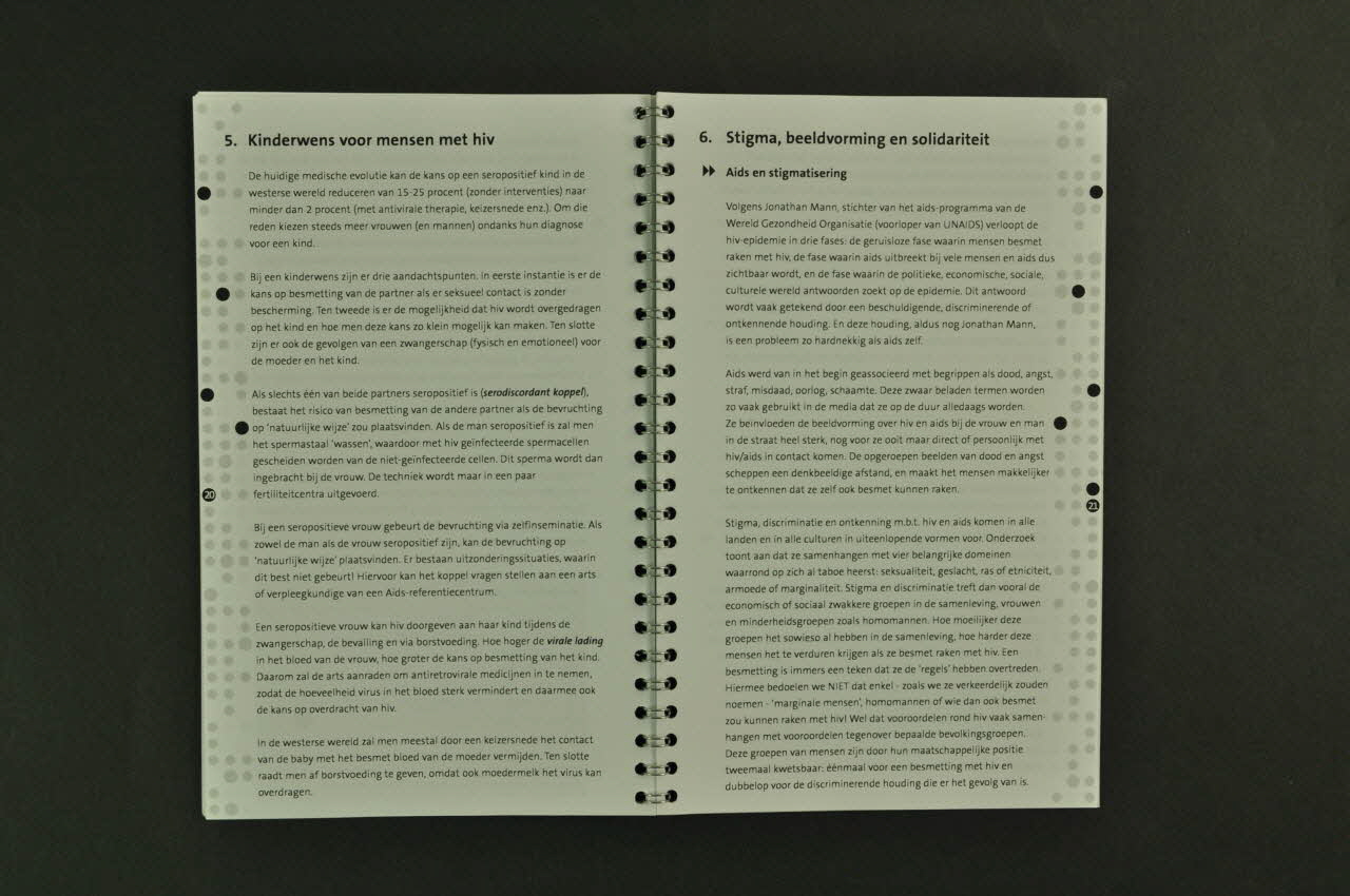 INHOUD // // INFORMATIE OVER AIDS // 1. Hiv/aids // 2. Leven met hiv // 3. Relaties // 4. Medicatie // 5. Kinderwens voor mensen met hiv // 6. Stigma, beeldvorming en media // // WERKVORMEN // 1. Leven met hiv // 2. Stigmatisering // // VERKLARENDE WOORDENLIJST // // BRONNEN - DOORVERWIJZING (Principaux titres du sommaire du livret, p. 5.), à l'intérieurDécor