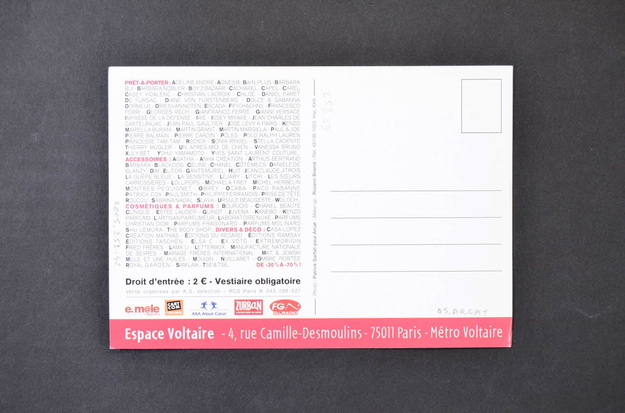 Au recto, sur fond blanc, la carte est divisée en deux horizontalement. En haut il y a la photo d'une femme avec une robe noire décolletée et derrière elle se tient un jeune homme torse nu. A gauche de la carte, en haut, il y a un rond rouge dans lequel, en blanc est notée une note : 10/10 (le "0" ayant une forme de coeur). En bas de la photo, en caractères blancs il y a le titre de la manifestation, dessous il y a une phrase présentant cette manifestation puis ses horaires d'ouverture. En bas on trouve les coordonnées de la manifestation et le logo de l'association à l'origine de la braderie. Au verso, la carte a un fond blanc. A droite, on a laissé un emplacement libre pour l'adresse et le timbre. A gauche, en petits caractères noirs, il y a la liste des créateurs participant. Dessous il y a le prix du droit d'entrée ainsi que les logos des partenaires. En bas dans un bandeau rose il y a l'adresse de la manifestation.Inscriptions