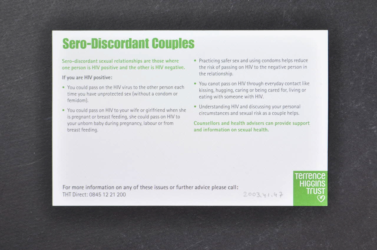 Sero-Discordant Couples / Sero-discordant sexual relationships are those where / one person is HIV positive and the other is HIV negative. / If you are HIV positive : / [...] / Counsellors and health adviser can provide support / and information on sexual health. (Texte imprimé en noir sur le fond blanc du dos de la carte avec le titre et un paragraphe en vert.), versoDécor