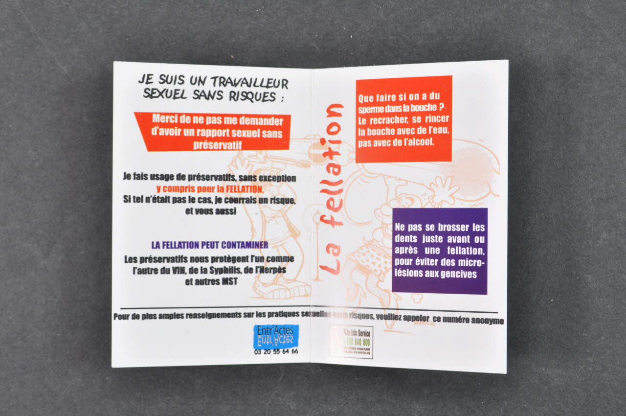 Je fais usage de préservatifs, sans exception / y compris pour la fellation / Si tel n'était pas le cas, je courrais un risque, / et vous aussi. (En dessous, en caractères noirs :)La fellation peut contaminerQue faire si on a du sperme dans la bouche ? Le recracher, se rincer la bouche avec de l'eau, pas avec de l'alcool (En haut, en blanc sur carré rouge :), à droiteLes préservatifs nous protègent l'un comme l'autre du VIH, de la Syphilis, de l'Herpès et autres MSTJe suis un travailleur sexuel sans risques, à gaucheNe pas se brosser les dents juste avant ou après une fellation, pour éviter des microlésions aux gencives (En bas, en blanc sur carré violet :), à droiteMerci de ne pas me demander d'avoir un rapport sexuel sans préservatif (En dessous, en blanc sur bandeau rouge :)Slogan