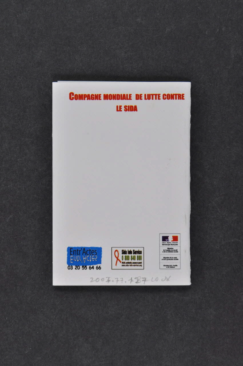 La couverture présente, sur un fond blanc, des titres noirs et rouges surmontant une illustration signée Babouze. Elle figure un jeune homme tirant une balle de revolver dans un grand préservatif tenu par une femme portant un décolleté. La balle du revolver est de couleur rouge, alors que le reste du dessin est noir. La balle a à la fois l'apparence d'une goutte de sang et du virus (boule à piquants). Entre eux, un réverbère. Le dos, à fond blanc, présente une inscription en haut, en rouge. En bas, se trouvent les logos de Entr'Actes, Sida Info Service et du Ministère de la Santé. . A l'intérieur, sur un fond blanc, en sous impression brune sur les deux feuillets, figure le dessin du garçon tirant au révolver. De nombreuses inscriptions figurent sur les feuillets.Inscriptions
