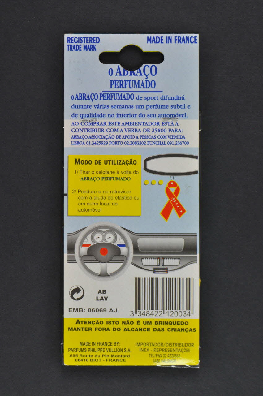 AO COMPRAR ESTE AMBIENTADOR ESTAA // CONTRIBUIR COM A VERBA DE 25$00 PARA: // ABRAÇO-ASSOCIAÇAO DE APOIO A PESSOAS COM VIH/SIDA // LISBOA 01.3425929 PORTO 02.2083302 FUNCHAL 091.236700 (Au centre, en bleu sur un bandeau blanc), versoNom d'association