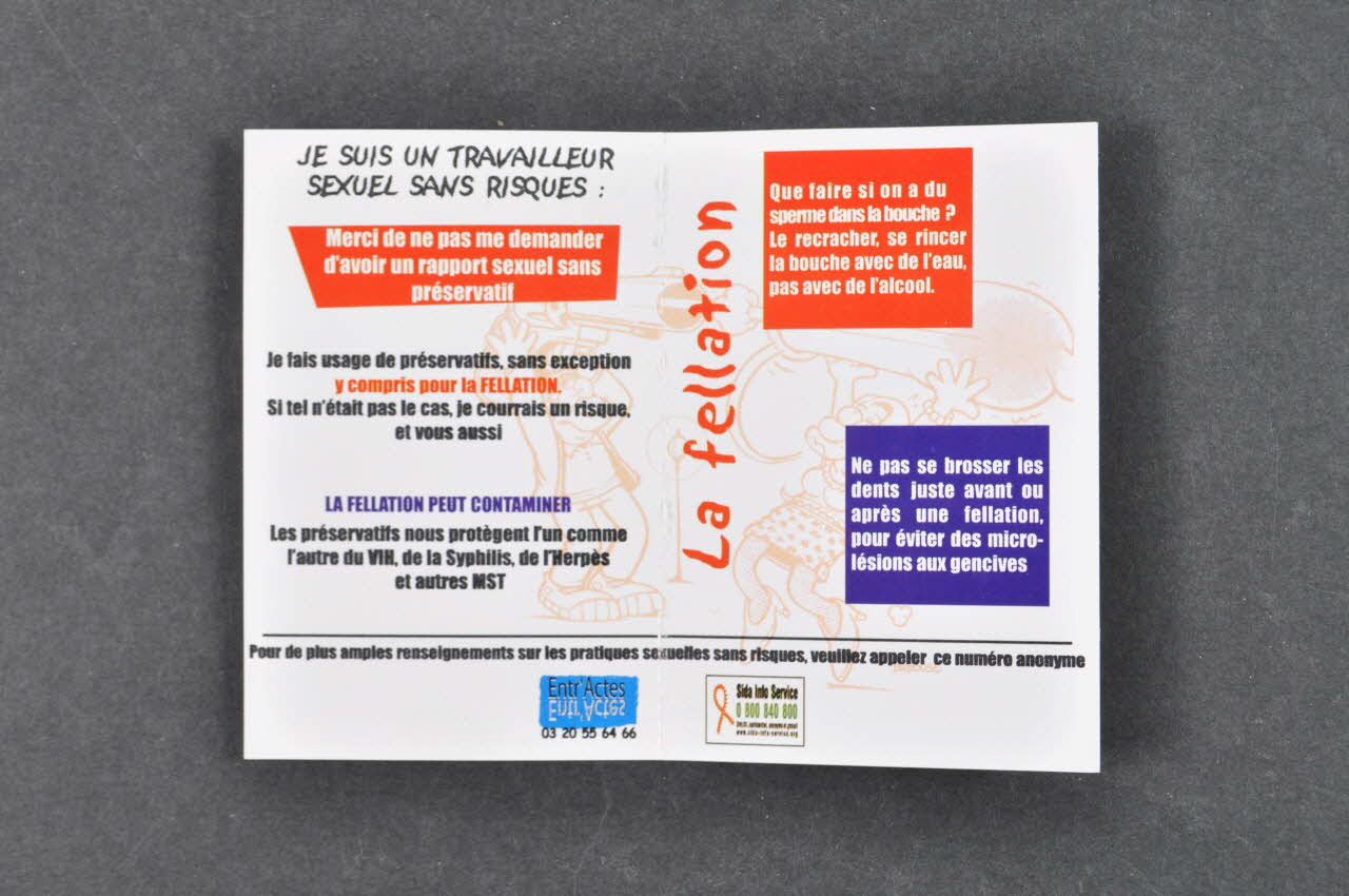 Je fais usage de préservatifs, sans exception / y compris pour la fellation / Si tel n'était pas le cas, je courrais un risque, / et vous aussi. (En dessous, en caractères noirs :)La fellation peut contaminerQue faire si on a du sperme dans la bouche ? Le recracher, se rincer la bouche avec de l'eau, pas avec de l'alcool (En haut, en blanc sur carré rouge :), à droiteLes préservatifs nous protègent l'un comme l'autre du VIH, de la Syphilis, de l'Herpès et autres MSTJe suis un travailleur sexuel sans risques, à gaucheNe pas se brosser les dents juste avant ou après une fellation, pour éviter des microlésions aux gencives (En bas, en blanc sur carré violet :), à droiteMerci de ne pas me demander d'avoir un rapport sexuel sans préservatif (En dessous, en blanc sur bandeau rouge :)Slogan