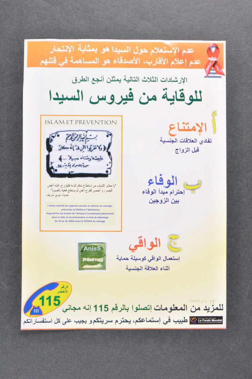 Au verso, sans doute le texte du dépliant 2006.63.05. Les textes proposent des recommandations pour se protéger : A comme Abstinence / B Fidélité / C Condom. Entre A et b, vignette Islam et prévention :"L'Islam interdit les rapports sexuels en dehors du mariage, préconsie la fidélité et l'abstinence. Aujourd'hui, les Imams de l'Afrique s'investissent pleinement dans la lutte et recommandent un test de dépistage du virus du sida avant la fatiha du mariage" / A côté de Condom, petit dessin d'une enveloppe de préservatif. Numéro vert.