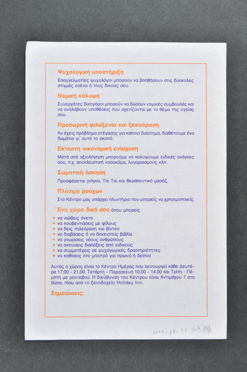 Feuillet en papier blanc, rectangulaire, imprimé des deux côtés en orange et violet proposant une présentation de l'association.Décor