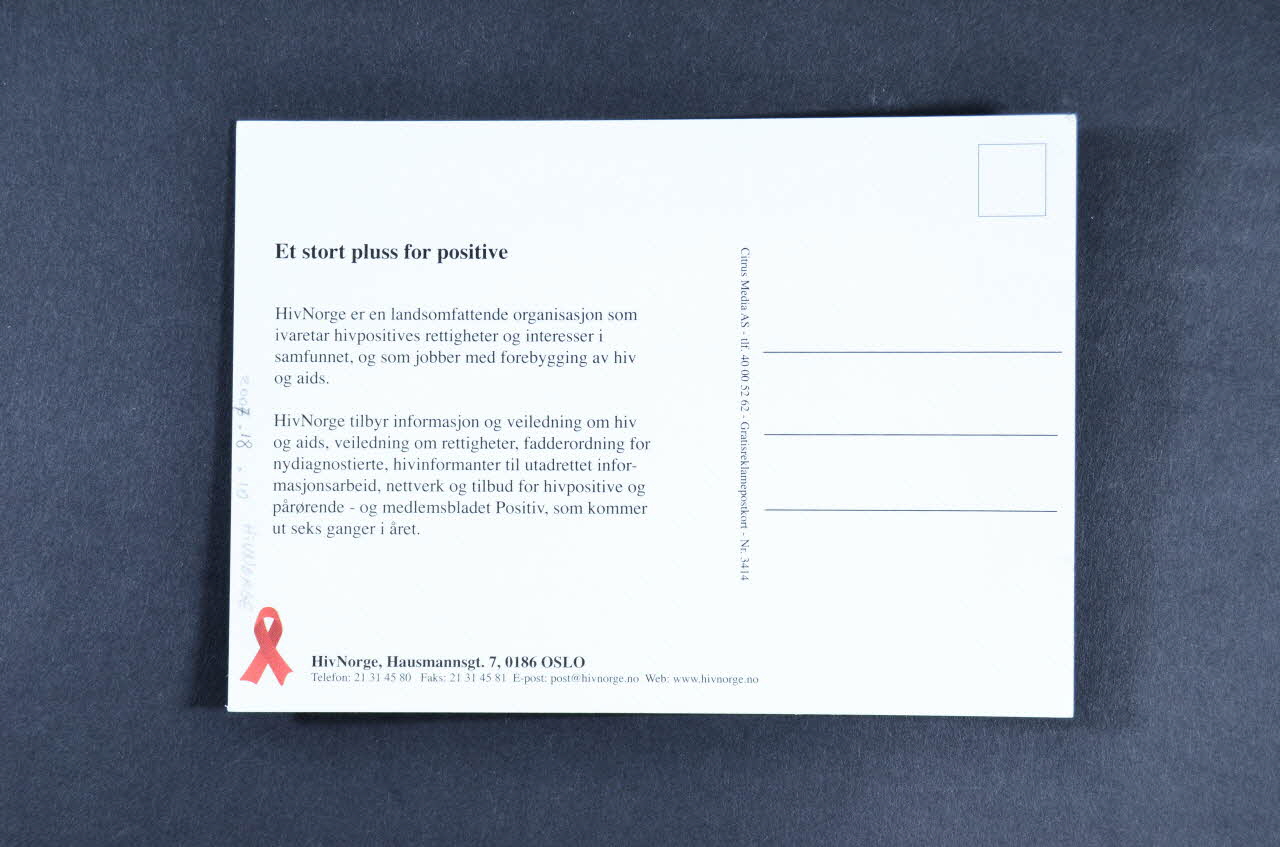Omtrent sänn ser en HIV-Positiv Ut (en lettres capitales blanches sur le bandeau vert), rectoEt stort pluss for positive (titre du texte présent sur la partie gauche), versoNom d'association