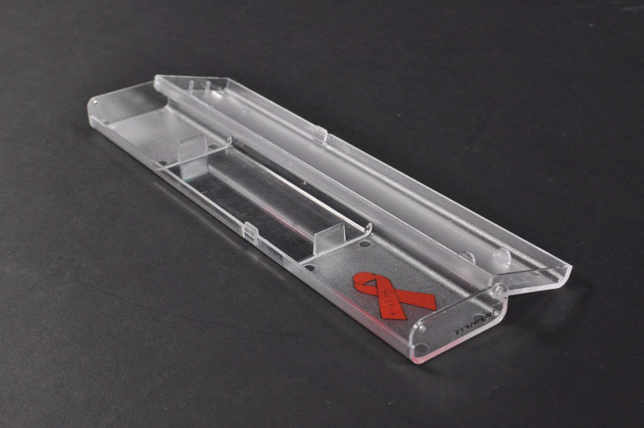 Boîte rectangulaire en plastique translucide pour ranger la montre (2003.19.14.1.1). Le couvercle pivote sur des gonds. Plusieurs petits pics ou buttoirs servent à caler la montre dans cet étui. Un autocollant représentant le ruban rouge avec des contours noirs est collé sur le bas du couvercle. Le nom de l'association figure sur l'autocollant. Un rectangle au centre du couvercle est en plastique transparent.Décor