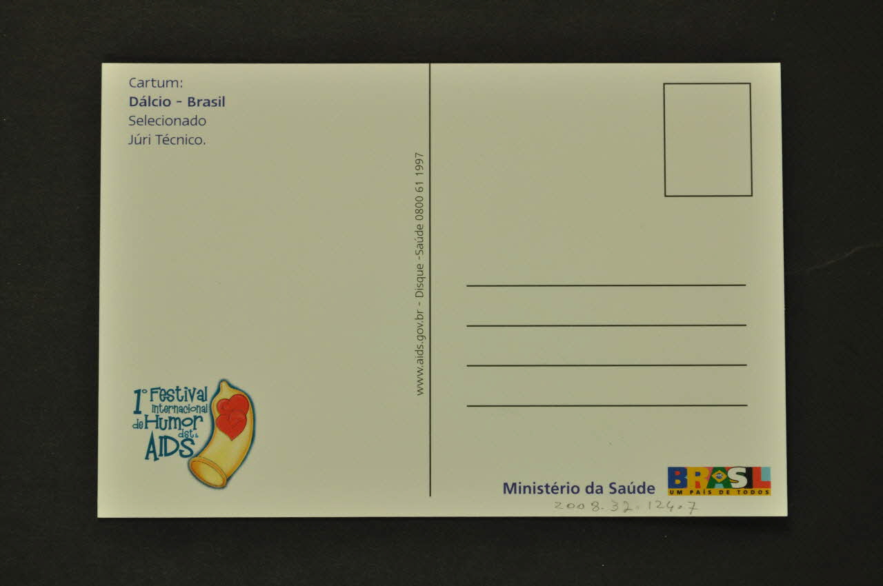 1° Festival // internacional // de Humor // dst & // AIDS (en bas à gauche, avec un dessin de deux coeurs dans un préservatif.), versoMinistério da Saúde BRASIL UM PAIS DE TODOS (en bas à droite), versoAuteur, concernant le lieu d'exécution