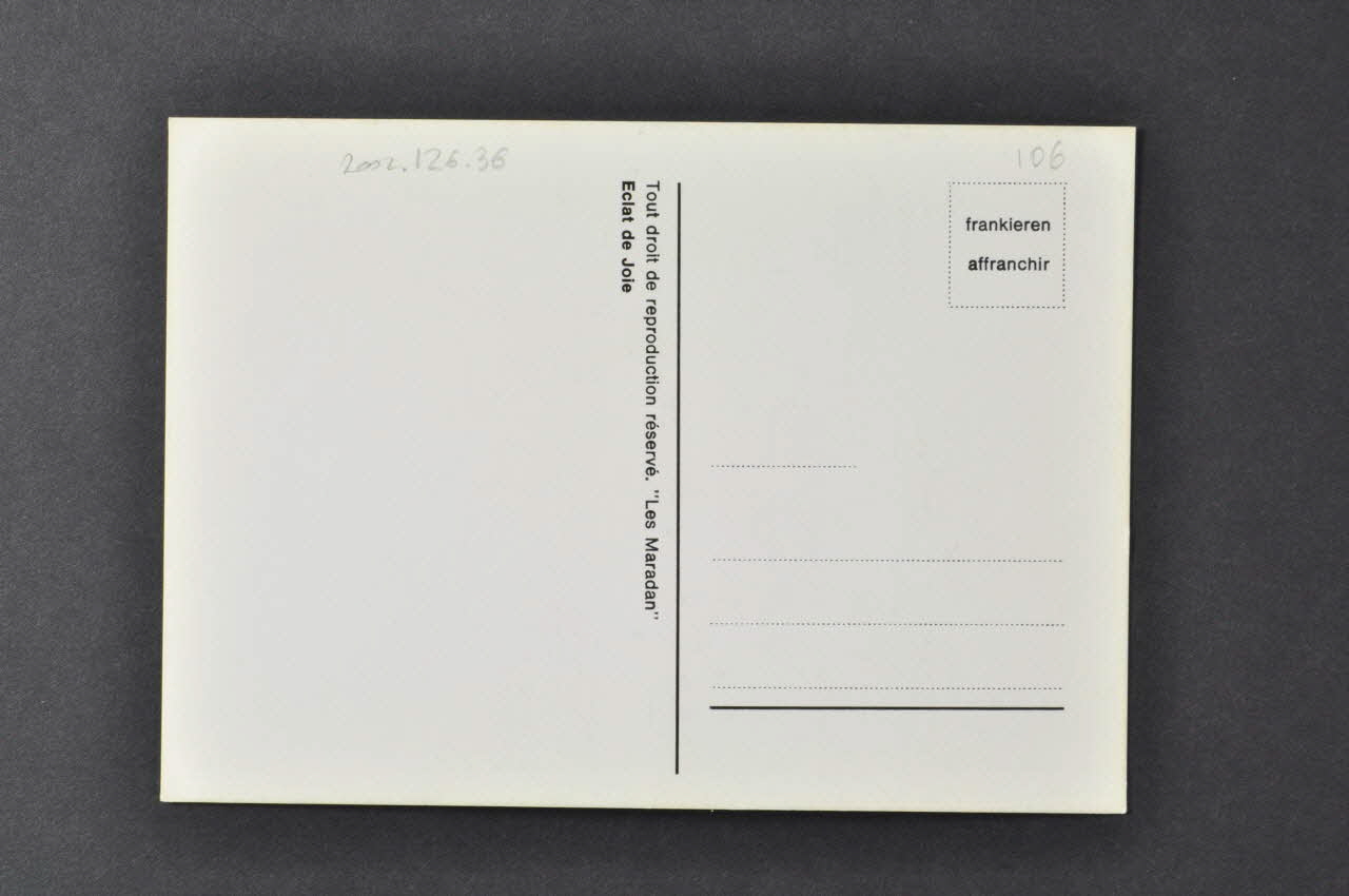 frankieren / affranchir (Inscription noté en deux langues dans l'emplacement destiné à l'affranchissement.), versoTout droit de reproduction réservé. "Les Maradan" / Eclat de Joie (Au dos de la carte, au milieu, inscription verticale.), versoDécor
