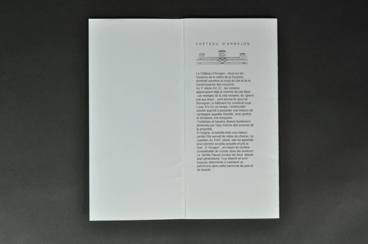 De forme rectangulaire, le dépliant en carton blanc plié en trois se lit verticalement. Il contient quatre feuillets blancs volants rectangulaires, se lisant aussi verticalement et présentant des inscriptions noires. Sur la couverture figure un logo composé de trois photographies en noir et blanc. Elles représentent un oeil, une bouche et une oreille, détails d'une sculpture. Au dessus et en dessous sont imprimées des inscriptions noires. Au verso on retrouve les mêmes photographies disposées différemment au dessus d'inscriptions noires. A l'intérieur, une seule page est imprimée. Y figurent des inscriptions noires et le dessin en noir du château d'Arnajon.Inscriptions