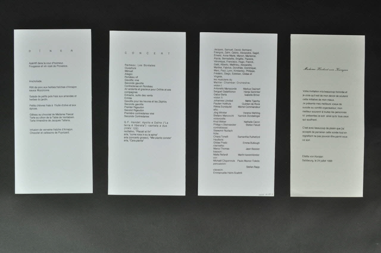 [] // // C'est avec beaucoup de plaisir que j'ai // accepté de parrainer cette soirée tout en // regrettant ne pas pouvoir être parmi vous // ce soir. // // Eliette von Karajan // Salzbourg, le 24 juillet 1998 (Lettre imprimée sur un feuillet placé à l'intérieur du dépliant.), à l'intérieurSommaire