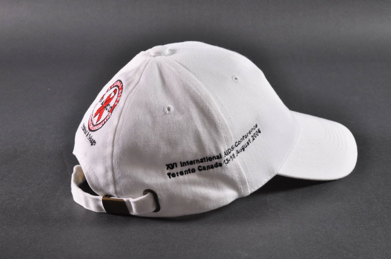 Sur le devant est cousu un logo en capitales rouges dans un rectangle blanc entouré de noir. Au dos, le logo de National Aids Coordinating Committee / Trinidad et Tobago, est brodé en blanc, rouge et noir, avec petit ruban rouge.Inscriptions