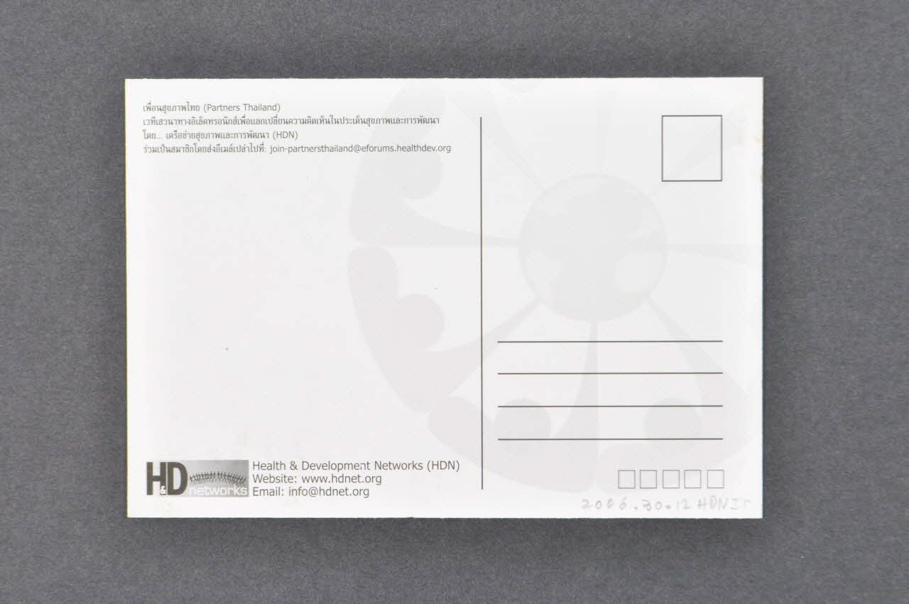 [...] (Partners Thailand) // join-partnersthailand@eforums.healthdev.org (Dans le coin inférieur à gauche // Seuls les caractères latins sont transcrits), rectoH&D networks // Health & Development Networks (HDN) // Website : www.hdnet.org // Email : info@hdnet.org (En bas à gauche), versoTexte