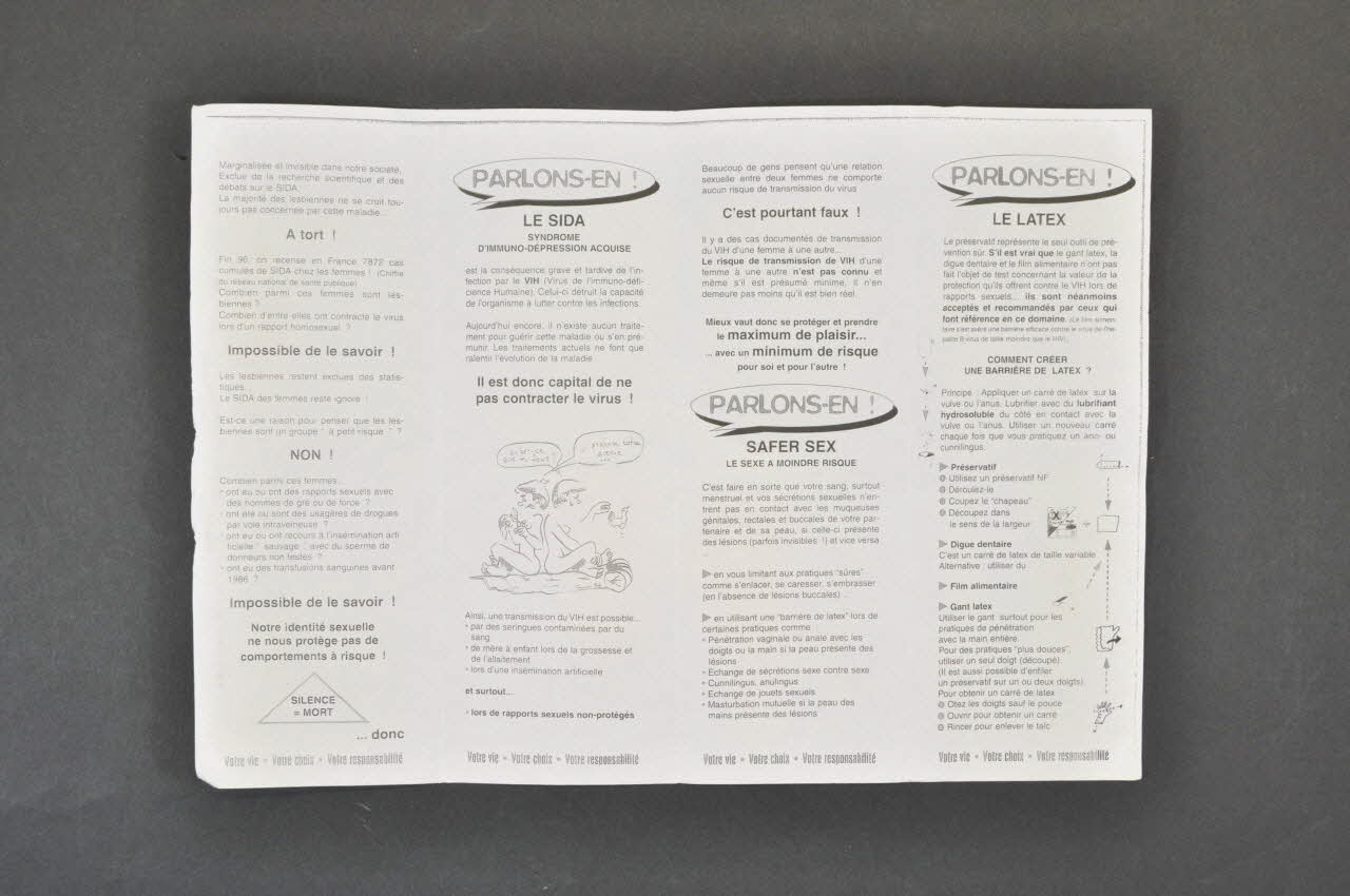 Le dépliant entoure une digue dentaire contenue dans une enveloppe en plastique (2002.127.27.2). Résumé: Volet 2 ; (...) "La majorité des lesbiennes ne se croit toujours pas concernée par la maladie. A tort ! Fin 96 on recense 7872 cas cumulés de sida chez les femmes" ; impossible de savoir combien sont lesbiennes (...) En gras : "Notre identité sexuelle ne nous protège pas de comportements à risque !" Dans un triangle : "Silence = mort ... donc Volet 3 (en gros) "Parlons-en" - Le SIDA (Syndrome d'Immuno-Dépression Acquise) (...) aucun traitement pour guérir ou prévenir... - En gras : "Il est donc capital de ne pas contracter le virus !" En dessous : dessin, deux femmes nues assises dos à dos, l'une découpant un morceau de latex, bulles : "qu'est-ce-que tu fous?" "J' prépare notre avenir..." En dessous : "Ainsi une transmission du VIH est possible... par des seringues contaminées par du sang / de mère à enfant lors de la grossesse et de l'allaitement / lors d'une insémination artificielle et surtout lors de rapports sexuels non protégés. Volet 4 - Faux de penser que les relations sexuelles entre femmes ne comportent aucun risque. Risque minime mais réel. "Mieux vaut donc se protéger et prendre le maximum de plaisir avec un minimum de risque pour soi et pour l'autre. SAFER SEX. Le sexe à moindre risque "C'est faire en sorte que votre sang, surtout menstruel et vos sécrétions sexuelles n'entrent pas au contact avec les muqueuses génitales, rectales et buccales de votre partenaire et de sa peau, si celle-ci présente des lésions (parfois invisibles !) et vice versa. - en vous limitant aux pratiques "sûres" comme s'enlacer, se caresser, s'embrasser (en l'absence de lésions buccales) - en utilisant une "barrière de latex" lors de certaines pratiques comme : pénétration vaginale ou anale avec les doigts ou la main si la peau présente des lésions ; échange de sécrétions sexe contre sexe ; cunnilingus, anulingus ; échange de jouets sexuels ; masturbation mutuelle si la peau des mains présente des lésions. Volet 5 " LE LATEX Le préservatif représente le seul outil de prévention sûr. S'il est vrai que le gant latex, la digue dentaire et le film alimentaire n'ont pas fait l'objet de test concernant la valeur de la protection qu'ils offrent contre le VIH lors de rapports sexuels ... ils sont néanmoins acceptés et recommandés par ceux qui font référence en ce domaine. Comment créer une barrière de latex? "Principe : appliquer un carré de latex sur la vulve ou l'anus. Lubrifier avec du lubrifiant hydrosoluble du côté en contact avec la vulve ou l'anus. Utiliser un nouveau carré chaque fois que vous pratiquez un ano- ou cunnilingus." Conseils avec schémas : comment découper un préservatif. Alternatives à la digue dentaire : film alimentaire; gant latex Volet 6 "Mais encore... - Eviter de se brosser les dents avant un rapport sexuel (cela peut provoquer des lésions buccales) - Ne pas échanger d'objets sexuels avec ses partenaires sans les avoir néttoyés (alcool 70°, Javel) ou recouverts d'un préservatif neuf à chaque fois - Refuser tout échange d'aiguilles et de seringues - Exiger un matériel à usage unique ou désinfecté lors des opérations de tatouage, de piercing... - Refuser "l'insémination artificielle sauvage". Les MST : maladies sexuellement transmissibles (...) Volet 7 LE TEST DE DEPISTAGE (...)