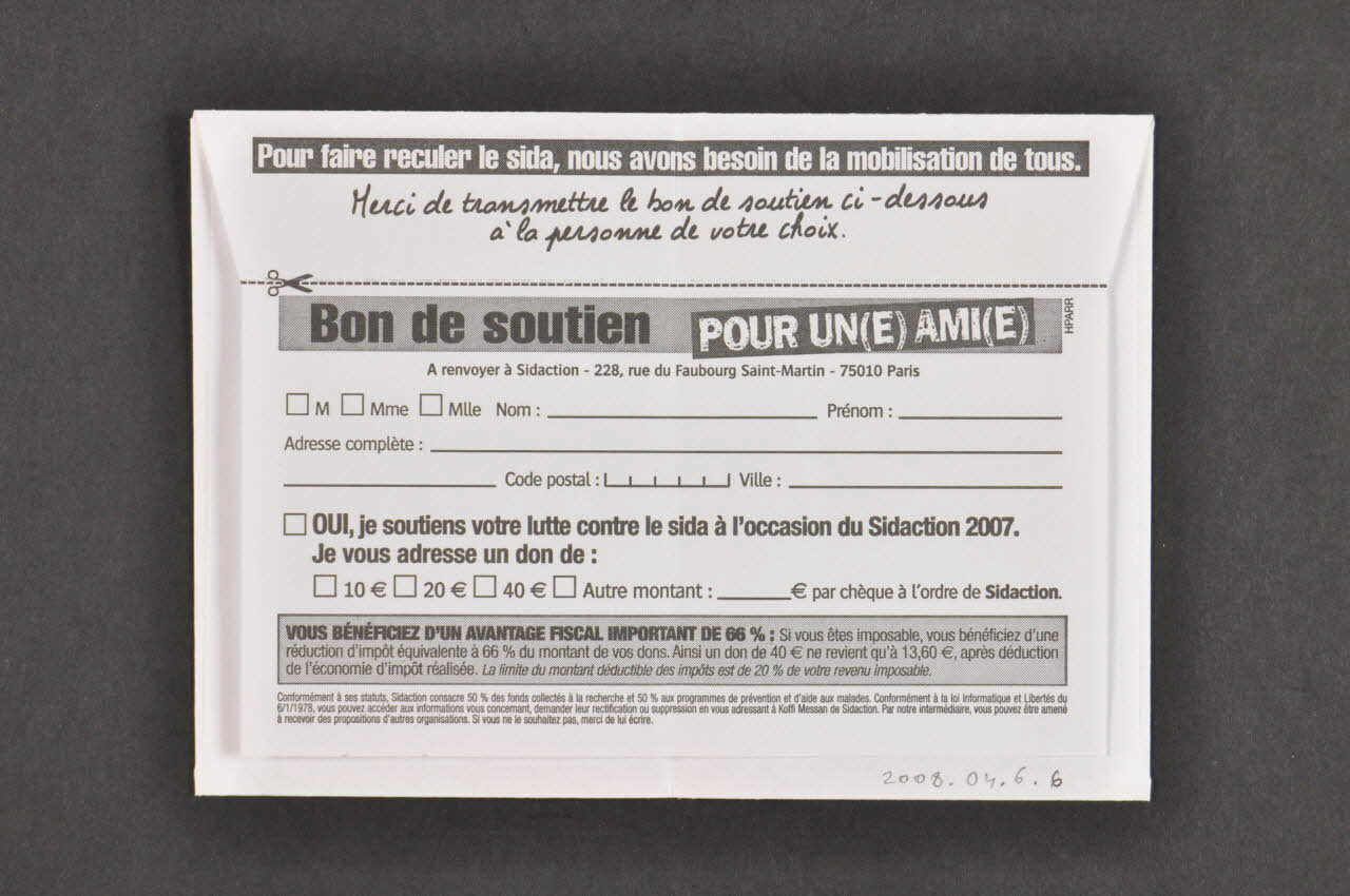 Au recto on peut voir une adresse et un logo d'association. Au verso il y a un bon détachable afin de faire un don. Le texte est en noir sur fond blanc.Inscriptions
