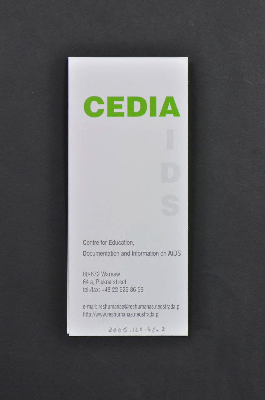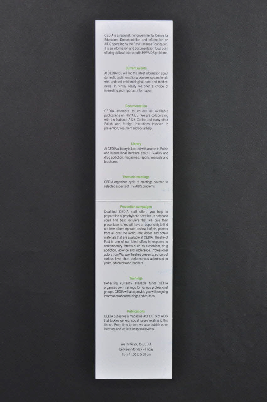 CEDIA // AIDS // Centre for Education, // Documentation and Information on AIDS // [coordonnées] // // [ruban rouge] // "Red ribbon" // is an international symbol // of solidariety with people sick with AIDS // and persons living with HIV. // [coordonnées] (Sur les deux faces externes.), dessusSous-titre
