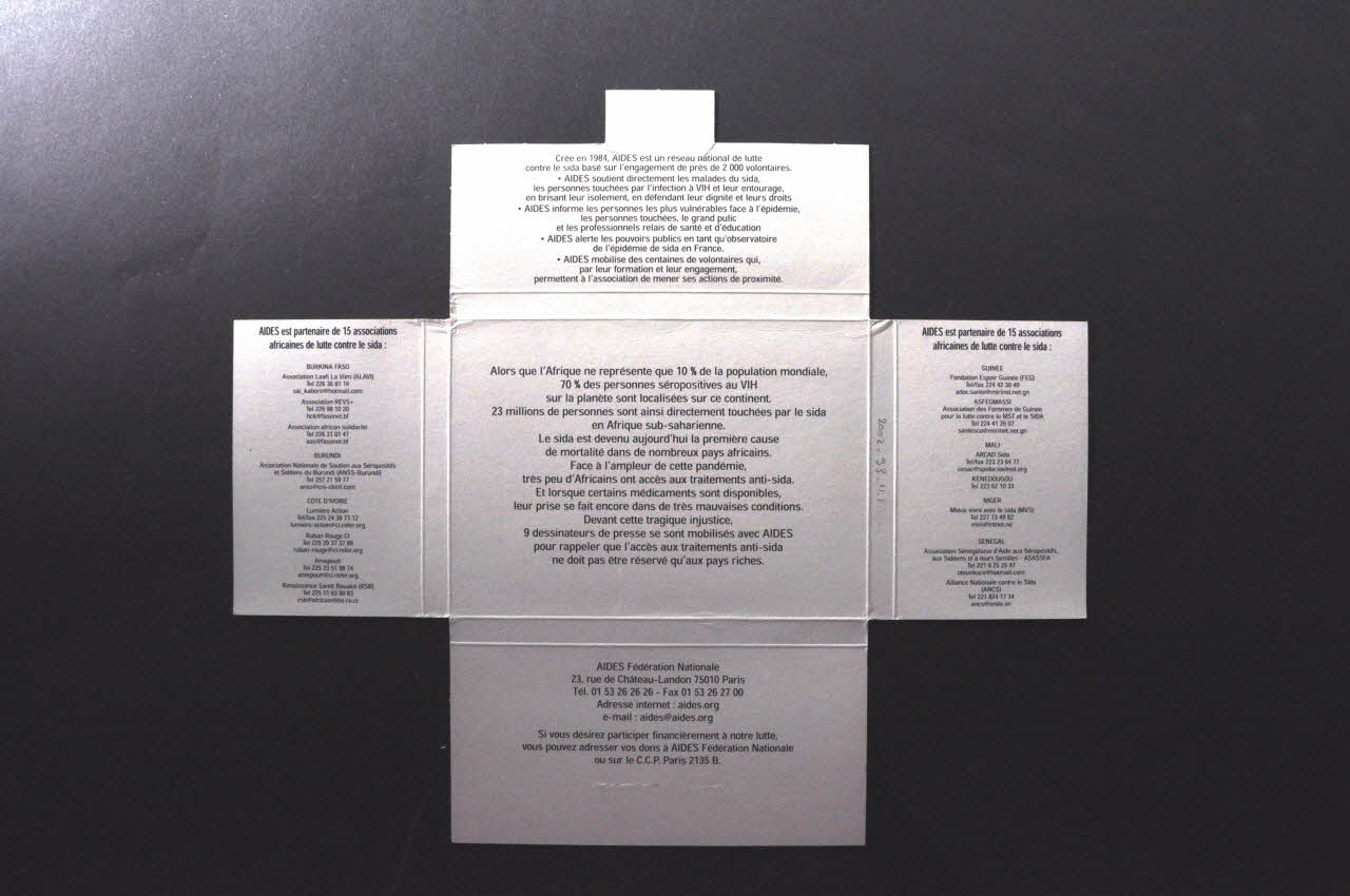 Date : 2002Utilisateur : AIDESCampagne de mobilisation de l’Association AIDES pour l’accès aux traitements en Afrique en soutien aux 15 associations africaines partenaires de l’association au Burkina (3), Burundi (1), Côte d'Ivoire (4), Guinée (2), Mali (2), Niger (1), Sénégal (2). Le CRIPS est un des lieux de vente de ces cartes postales.