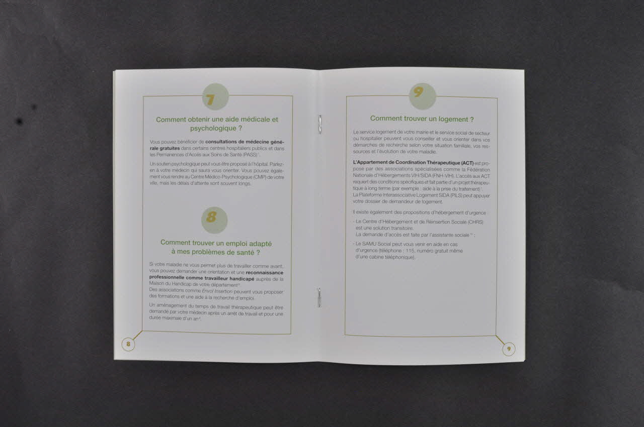1. Je suis français ou je possède un titre de séjour, comment mes frais de santé vont-ils être pris en charge ? // 2. Je suis sans papiers, puis-je bénéficier d'une prise en charge ? // 3. Puis-je être pris en charge pour l'ensemble de mes dépenses de santé ? // 4. Que faire pendant le délai de mise en place de ma prise en charge ? // 5. De quelles ressources puis-je bénéficier ? // 6. Aides matérielles ponctuelles // 7. Comment obtenir une aide médicale et psychologique ? // 8. Comment trouver un emploi adapté à mes problèmes de santé ? // 9. Comment trouver un logement ? // 10. Je dois être hospitalisé(e), à qui faire appel pour la garde de mes enfants ? // 11. Mon état de santé se dégrade, de quelle aide puis-je bénéficier pour rester à mon domicile ? // Conclusion (Imprimé en vert sur blanc au debut de chaque partie), à l'intérieurLogo, nom d'association