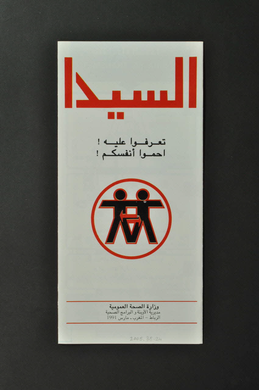 De forme rectangulaire, le dépliant en papier blanc est plié en trois. Il se lit verticalement. Sur le premier feuillet, une inscription rouge et des inscriptions noires occupent la partie supérieure. En dessous se trouve le logo du Ministère de la Santé publique marocain. Il est composé de deux pictogrammes représentant des personnages bras écartés, noirs entourés de rouge et reliés par deux flèches rouges parallèles de sens opposé. L'ensemble est entouré par un cercle rouge. En partie inférieure sont imprimées des inscriptions en noir. Le verso est identique à la couverture mais il est rédigé en Arabe. A l'intérieur, une page présente uniquement des inscriptions noires et un schéma représentant le virus du SIDA. Sur les trois autres pages figurent des inscriptions noires dans des rectangles colorés accompagnés de schémas rouges, jaunes, bleus et noirs. En haut de chaque page, un rectangle coloré contient une inscription blanche.Inscriptions