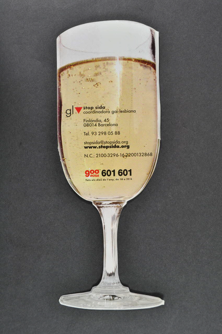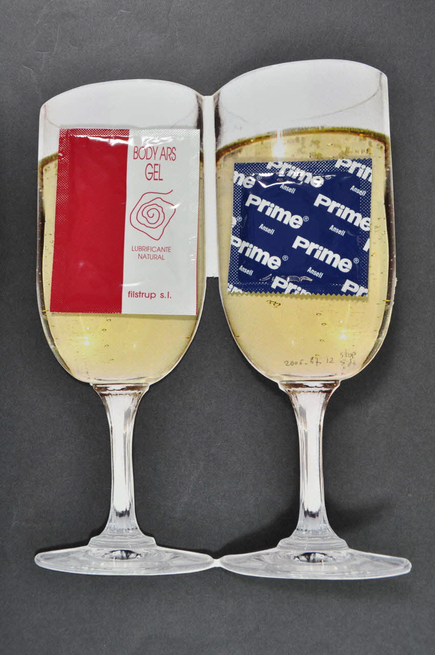 Etui de préservatif et de lubrifiant en carton imprimé et découpé en forme de coupe de champagne. Il est constitué de deux rabats à l'intérieur desquels sont collés le gel lubrifiant et le préservatif masculin dans des emballages individuels. Le fond de la face antérieure représente une coupe pleine de champagne. Au centre est inscrite l'année 2005 en marron et avec les zéros sous la forme de deux anneaux en or. En-dessous se trouve une inscription italienne en lettres noires. Au revers, sur le même fond imprimé, sont indiqués le nom et les coordonnées d'un centre d'information et de dépistage. A l'intérieur, chaque rabat est imprimé du même fond que les faces extérieures. Le lubrifiant est collé sur le rabat gauche, et le préservatif masculin est collé sur le rabat droit.Inscriptions