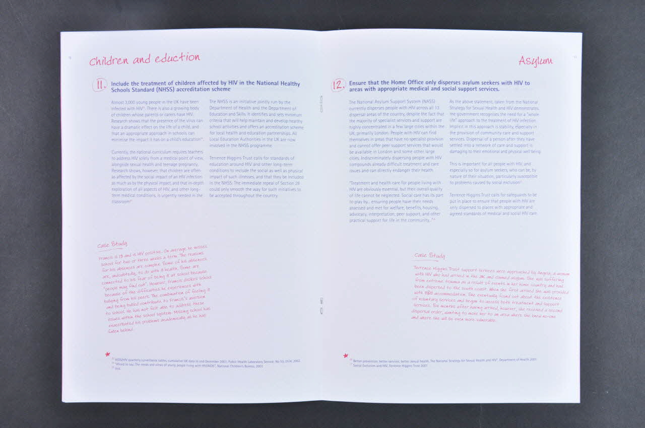 Soins // 1 Refaire du VIH et de la santé sexuelle un domaine prioritaire pour le National Health Service // 2 Développer un guide pratique pour la santé sexuelle et le VIH // 3 Sortir des guides pour la formation sur le VIH pour des praticiens non spécialistes // 4 Sortir des guides de meilleure pratique pour des médecins généralistes en relation avec le VIH // 5 Aider des personnes en situation de stigmatisation à siéger dans des forums de patients // 6 Modifier les critères de traitement d'urgence pour des visiteurs de long séjour séropositifs // Travail // 7 Etendre le "Disability Discrimination Act" (handicap) à la couverture des personnes séropositives ou ayant d'autres maladies à long terme, à partir du moment du diagnostic, avec un effet immédiat. // 8 Développer un code de l'emploi des personnes séropositives // 9 Changer les "linking rules" pour aider les personnes séropositives et d'autres personnes ayant des maladies à long terme, à obtenir une flexibilité au travail // 10 Etablir un groupe de travail pour réviser les pratiques des compagnies d'assurance britanniques à l'égard du VIH // Enfants et éducation // 11 Inclure le traitement des enfants affectés par le VIH dans le National Healthy Schools Standard // Asile // 12 S'assurer que les demandeurs d'asile séropositifs sont envoyés dans des zones avec des services médicaux et sociaux appropriés // 13 Fournir des guides donnant des informations de base sur le VIH pour les services en contact direct avec les demandeurs d'asile // 14 Donner aux demandeurs d'asile des informations claires et culturellement appropriées sur le dépistage et les traitements du VIH // 15 Etendre le "Welfare Milk Token" à toutes les mères demandeuses d'asile, y compris celles qui sont séropositives // Recherche // 16 Aider des recherches sur les besoins et les préoccupations des personnes séropositives // Gouvernement // 17 Etablir un réseau trans départemental pour combattre la discrimination envers les personnes séropositives // 18 Développer et suivre un échéancier pour répondre aux engagements à l'égard du fonds mondial // Prisons et centres de détention // 19 Rédiger des instructions pour que des préservatifs soient disponibles gratuitement dans les prisons // 20 Rédiger des guides pour les soins aux détenus séropositifs (au dos de la couverture)Logo