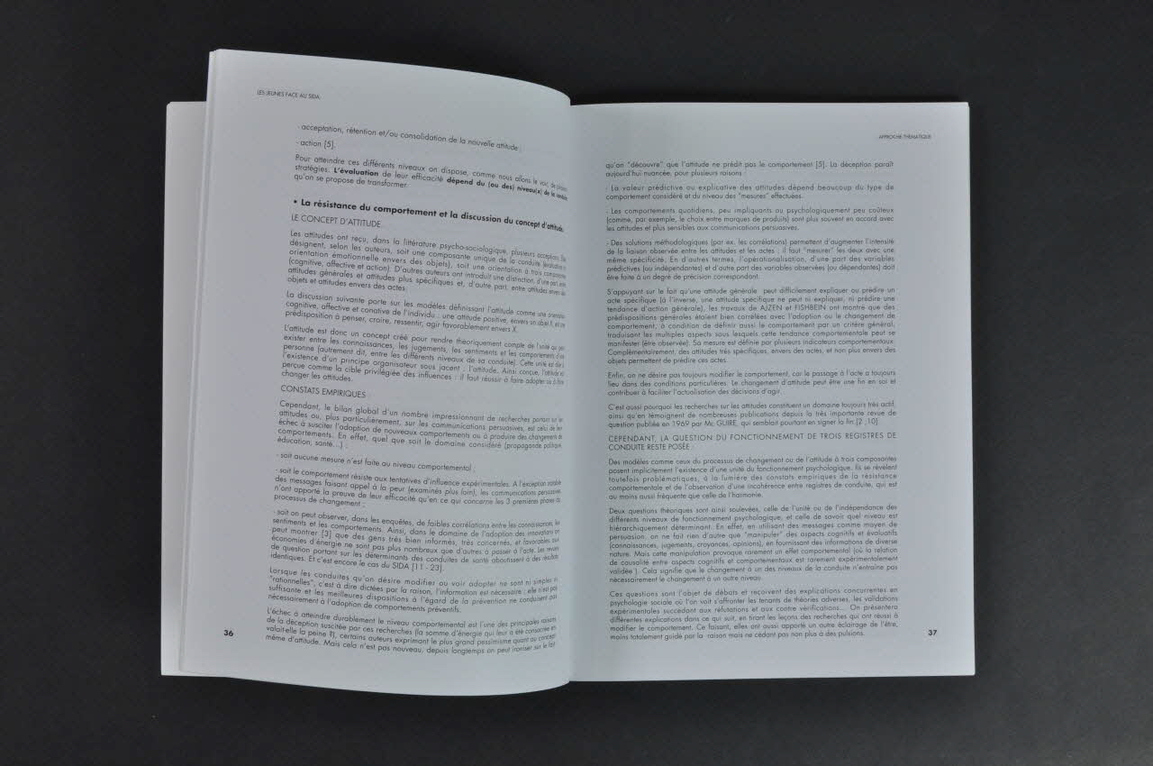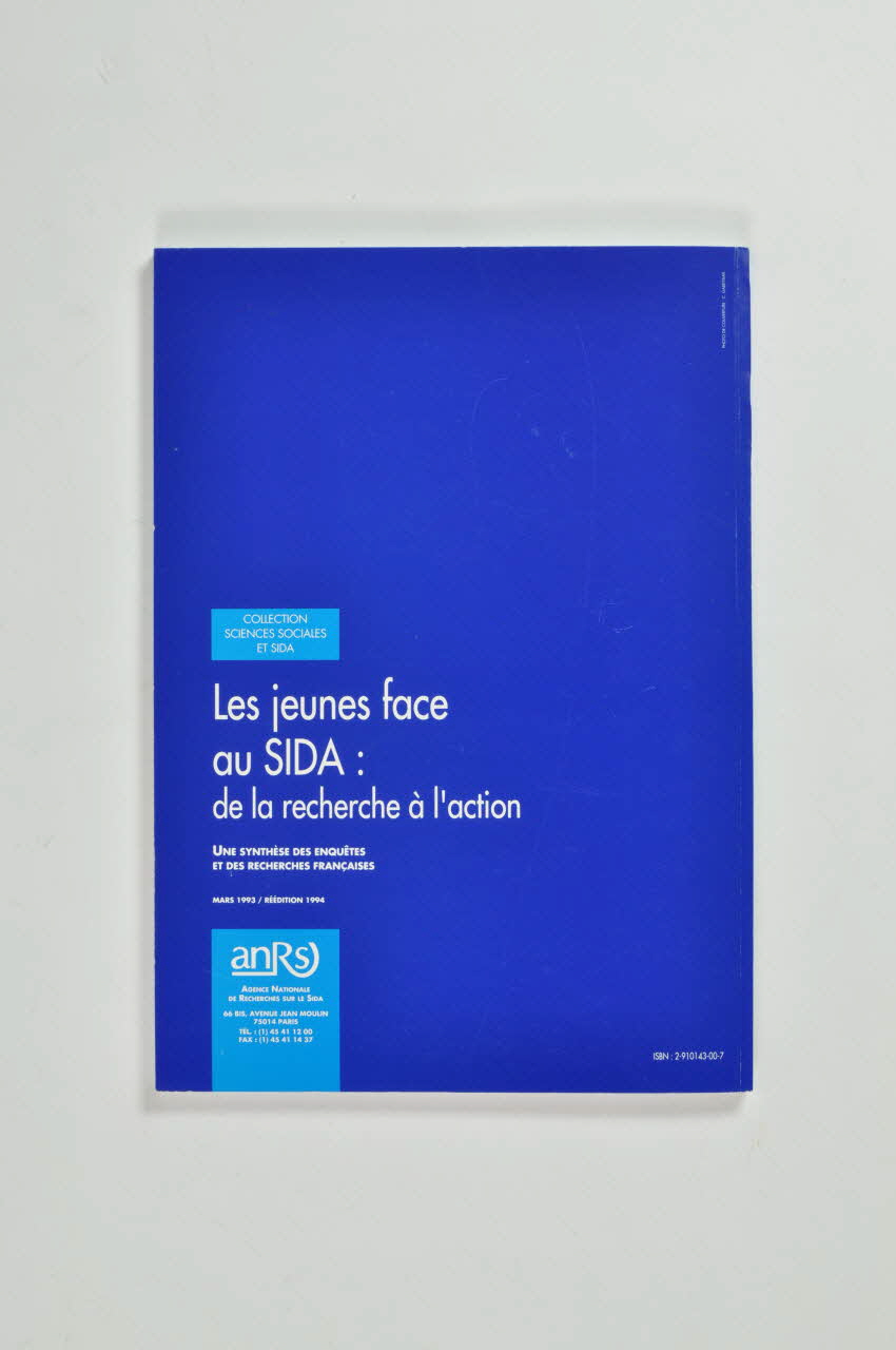 Livre de 128 pages à couverture souple inscrite en blanc sur fond bleu. Fond composé d'une photographie floutée représentant un rassemblement de personnes. En bordure supérieure, au centre "Collection sciences sociales et sida". Au centre, titre : "Les jeunes face au SIDA : de la recherche à l'action. Une synthèse des enquêtes et des recherches françaises. Mars 1993. Réédition 1994". En bordure inférieure "ANRS / Action coordonnée n°9 "Mécanismes et obstacles de la prévention". Inscriptions reproduites au dos sur fond uni bleu.