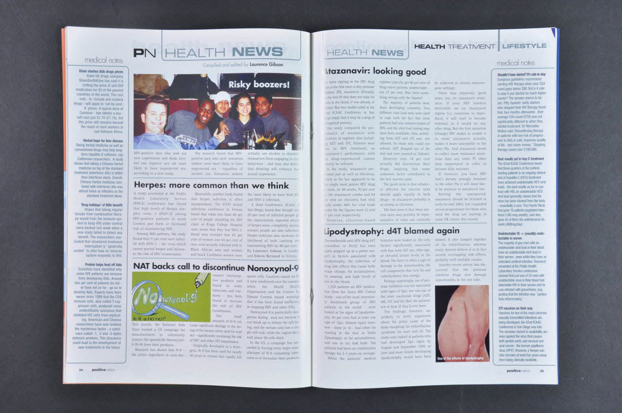 Précisions sur le contenu : - p. 14 Interview d'un ancien volontaire séropositif de Crusaid - p. 18 Témoignage d'une jeune américaine (titre de couverture) - p. 22 Téléréalité et sida (émissions montrant ce que c'est que vivre avec le VIH) - p. 24 Reportage sur le pays de Galles (titre de couverture) - p. 26 Le sida à la Jamaique (titre de couverture) - p 52 L'écrivain Jamaicain Juan Goytisolo Santé, Traitements et style de vie - p. 30 Conseils sur les traitements, éviter les effets secondaires (grand titre de couverture) - p. 36 Nouvelles sur les traitements - p.38 Guide des Infections sexuellement transmissibles - p. 41 Douleurs dans les pieds - p. 42 Conseils de santé (la nourriture) - p. 44 Chlamydia et VIH p. 37 page éditée par Gay Men Fighting AIDS et Crusaid. Fond violet. Un homme flou, nu, tête baissée. Impresssion en caractères blancs (en anglais) En bas Ne vous redressant pas La perte de désir sexuel et la difficulté à devenir dur peut être le problème de n'importe qui, mais si vous êtes séropositif, cela peut être plus qu'un problème, pour différentes raisons... / Les traitements peuvent provoquer la perte de sensations et contribuer à provoquer la baisse de libido / L'anxiété et la peur de transmettre le virus ou d'être rejeté / Les problèmes sexuels peuvent être le résultat d'un bas niveau de testostérone, que l'on trouve souvent chez les hommes séropositifs / Le VIH peut endommager les nerfs du pénis, provoquant l'impuissance / La perte de libido peut conduire à la dépression." En bas, en blanc : N'abandonnez pas avec cela ! Il y a plusieurs possibilités pour faire quelque chose. Parlez à quelqu'un dans votre clinique.