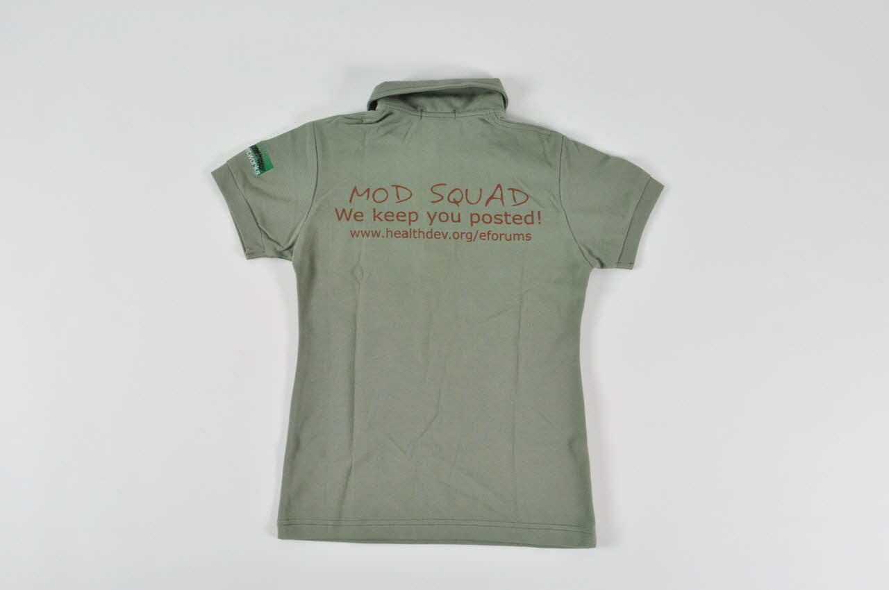 Sur la poche de poitrine à gauche, est brodée une roue multicolore (logo des e forums) composée d'une planète terre entourée d'une ronde de personnage tendant vers elle leur bras droit. Nom du forum au-dessus en italique et inscription "Resource Team" au dessous. Sur la manche gauche est brodé en vert le logo d'HD Networks. Au dos, en brun, est imprimé : "MOD SQUAD. We keep you posted ! www.healthdev.org/eforums".Inscriptions