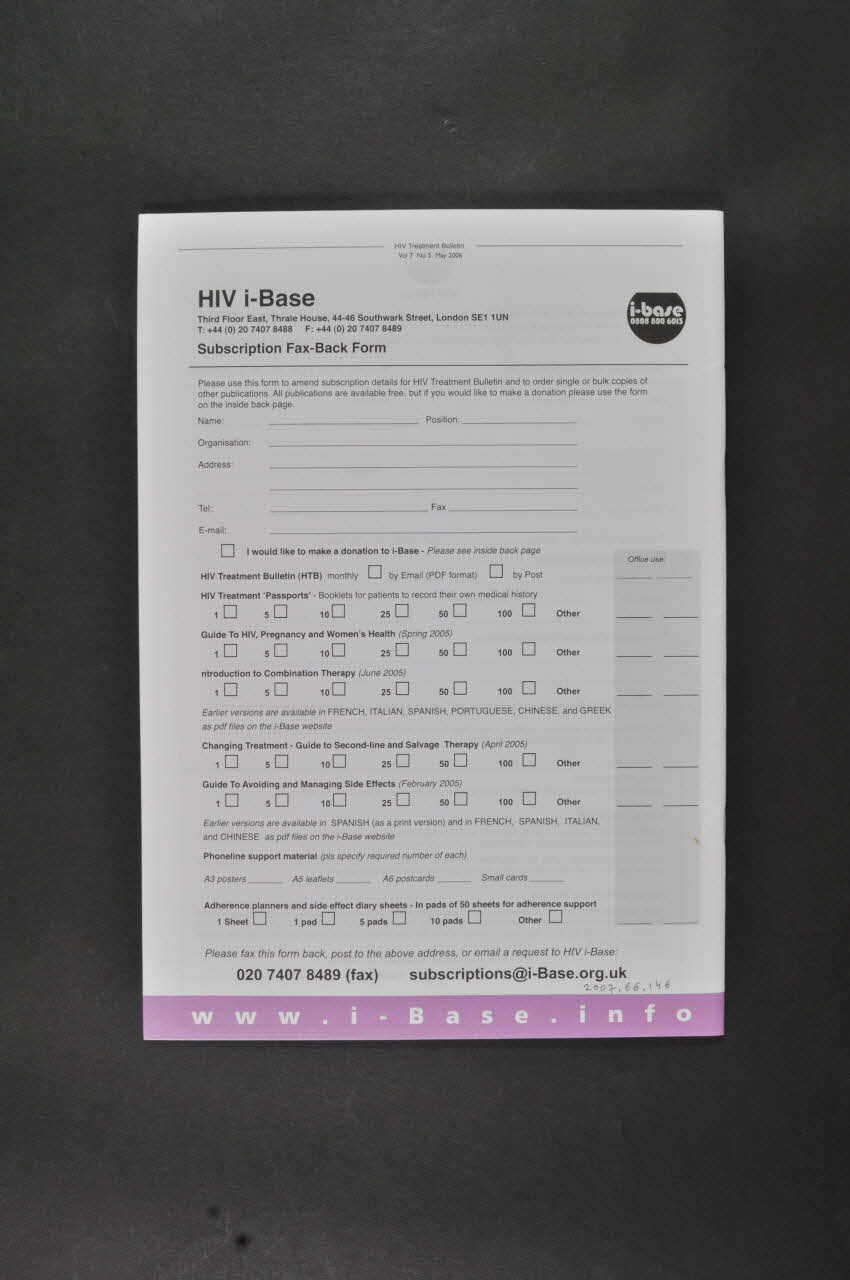 Published by HIV i-Base (En bas, sur le bandeau mauve), sur la couvertureDécor