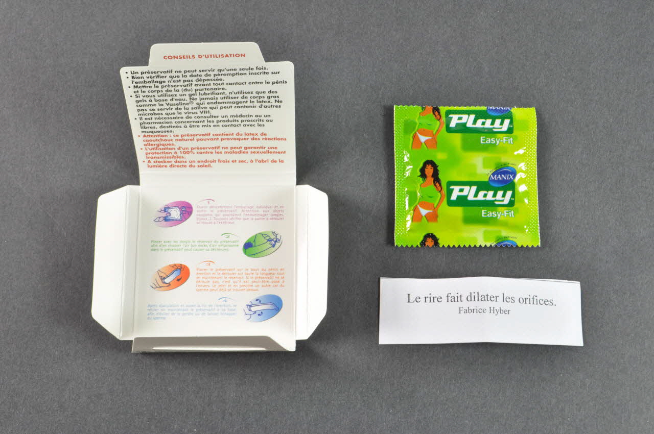 Le rire fait dilater les orifices. / Fabrice Hyber (Sur le papier.)l'amour est un plaisir qu'il faut protéger., rectoimages contre le sida et pour la solidarité / / Valère Dayan / © CRIPS Ile-de-France 2005., versoUn préservatif Manix Play TM lubrifié, / avec réservoir, versoMarque