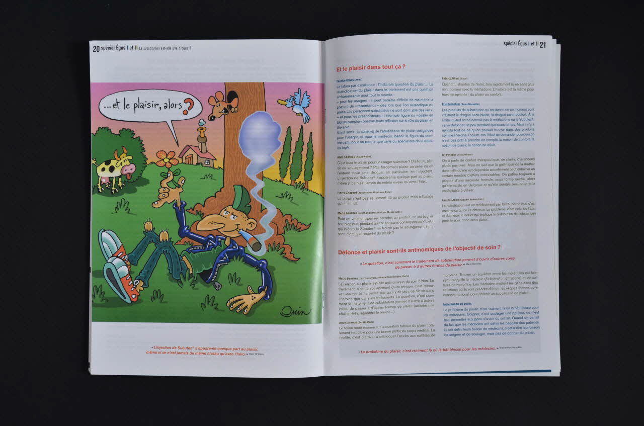 - p.3 : Edito : "Les drogués et l'anti-France" // - p.6 : Pourquoi les Egus // - p.7 : L'histoire de la substitution // L'alliance thérapeutique ou les relations médecins / patients : une succession de classiques. // - p.9 : Le choix de la molécule et celui du dosage // - p.10 : La qualité de la prise en charge // - p.11 : La violence // - p.12 : L'environnement social // Consommations et coconsommations // - p.13 : Le cadavre dans le placard : la cocaïne // - p.13 : Un grand classique : le cannabis // - p.14 : La substitution en prison // La substitution est-elle un médicament comme les autres ? // - p.15 : Certains pensent que oui... // - p.16 : D'autres pensent que non... // - p.16 : Et puis il y a ceux qui pensent ni oui ni non // - p.17 : Le sevrage // La substitution est-elle une drogue ? // - p.18 : Le "mésusage" ou comment un médicament devient drogue // - p.21 : "Et le plaisir dans tout ça" ? // - p.21 : Défonce et plaisir sont-ils antinomiques de l'objectif de soin ? // - p.22 : Une solution : les sulfates de morphine // - p.23 : Autre solution : la prescription initiale de méthadone en médecine de ville // La question politique // - p.24 : La RDR est-elle une véritable politique ? // - p.25 : Une grande absente : la citoyenneté des usagers // - p.27 : Le bilan des 12 travaux d'EGUS par Eric Schneider // - p.29 : Les 10 malentendus de la substitution selon Alain Morel // - p.32 : La synthèse de Laurent Appel // - p.33 : Bloody dans "Une affaire toxique" // Courrier p.36 // Adresses p.38 (sur la page1)Décor